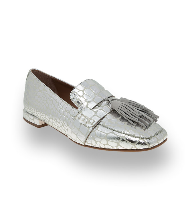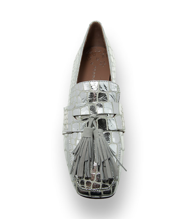 Silberfarbene Krokoprägung auf Glattleder und modischer Karreeleisten sind höchst wirkungsvoll und im Dauereinsatz. Zu voluminösen Hosen und Jacken, oversized Blazer, ein Glanzstück in ihrem Schuhschrank. Der Slipper mit Quasten von Pedro Miralles ist ein perfekter Begleiter um ihre Businessgarderobe modisch in Szene zu setzen.