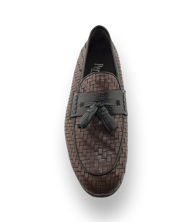 Aus handgeflochtenem Kalbsleder in Nougat mit dunkelblauer Lederspange und Quasten wird der Slipper zum unbeschwerten Styling-Partner. Hochwertiges Lederfutter, weich gepolsterte Lederdecksohle und eine Lederlaufsohle mit rutschsicherem Gummieinsatz garantieren höchsten Tragekomfort.
