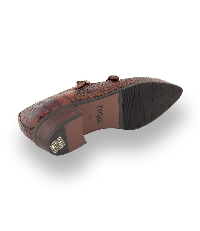 Der Hosenanzug, das Business-Outfit schlechthin, bekommt durch den edlen Doppelmonk den perfekten Begleiter. Der spitze Leisten und das braune Kroko geprägte Kalbsleder unterstreichen den angesagten Look. Pertini verleiht dem maskulinen Slipper durch die zwei dekorativen Schließen eine besondere Note.