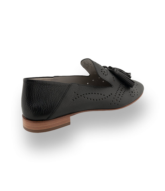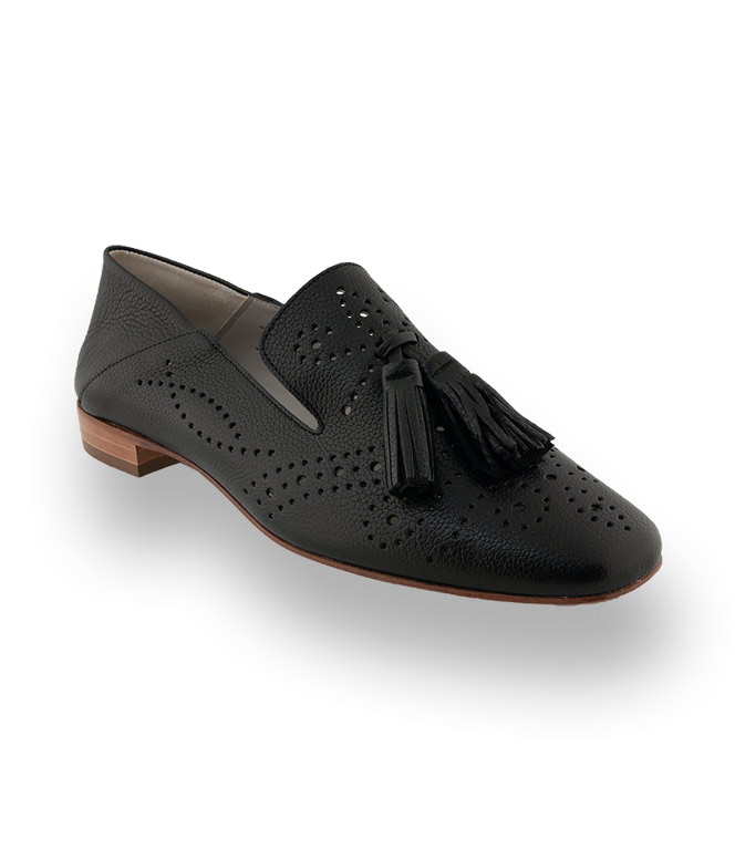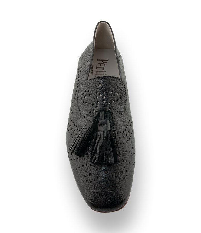Der schwarze Loafer aus genarbten Leder erlebt sein Comeback und ist vielfältig einsetzbar. Pertini pusht das Modell durch die modische Karreeform und ein schickes Lochmuster sorgt für Leichtigkeit. Quasten unterstreichen den lässigen Style. Die unverstärkte Ferse ermöglicht es den Slipper auch als Mule zu tragen. Reinschlüpfen und sich wohlfühlen. Fashion-Statements mit Format, die den Vergänglichkeitstest problemlos bestehen.