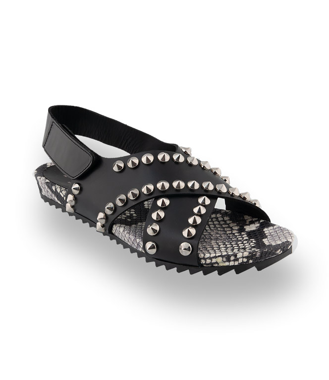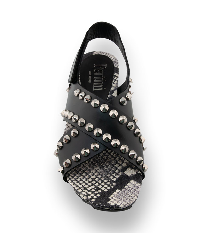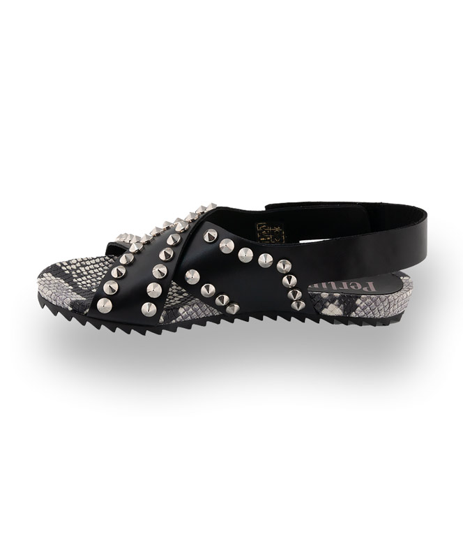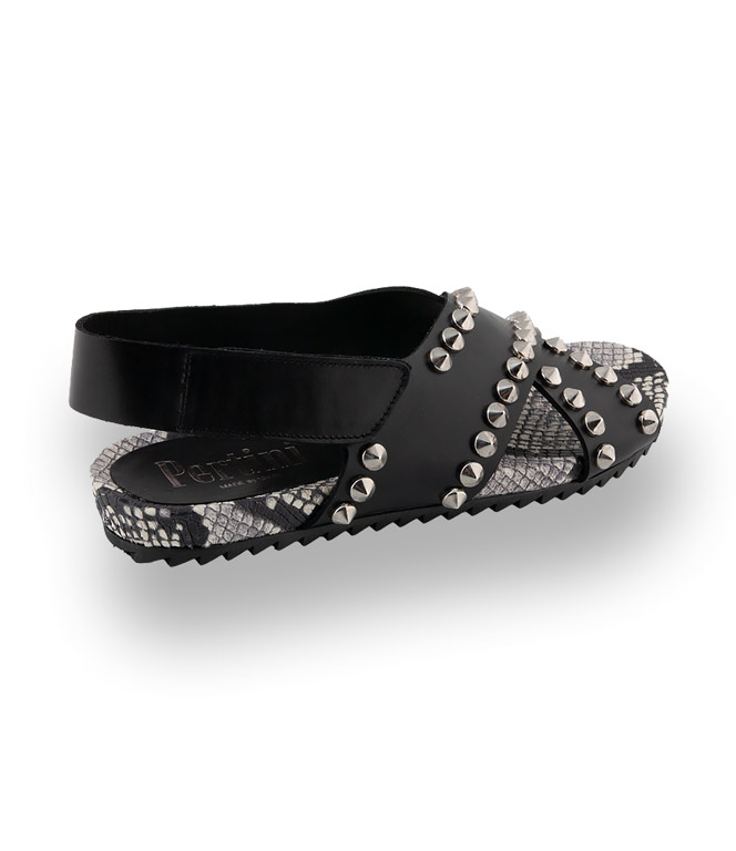Die Sandale von Pertini aus schwarzem Kalbsleder mit silberfarbenen Nieten und einer Lederdecksohle in Schlangenprint sorgt für einen außergewöhnlichen Style. Durch eine flexible und weiche Gummilaufsohle ist das sportliche Modell äußerst bequem. Hochwertiges Material in bester Verarbeitung garantiert hohen Komfort. Die neuen Flachen im jungen Design für die schönsten Tage im Jahr.