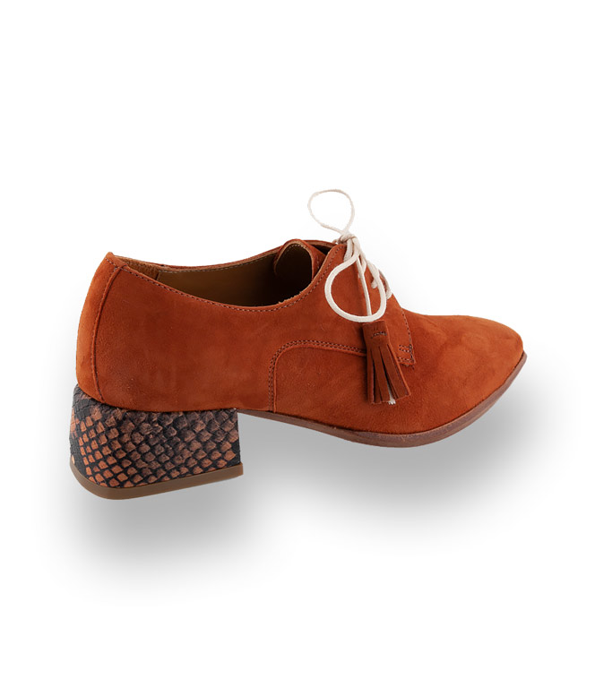 Schicker Schnürer von Pertini zur Blazerjacke mit maskulinem Cut und überschnittenen Schultern. Hosen sind verkürzt, schmal, weit und lang. Es entsteht ein Business-Look mit femininen Touch. Besondere Wirkung zeigt der spitze Schnürschuh aus rostfarbenen Veloursleder mit Quasten am Schnürsenkel. Ein 4 cm hoher, ausgestellter Absatz in Snakeoptik, eine weich gepolsterte Lederdecksohle, Lederfutter und eine Lederlaufsohle sorgen für angenehme Stunden an arbeitsintensiven Tagen. Moderne Interpretation der Frau des 21. Jahrhunderts.