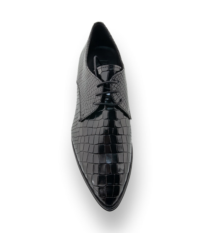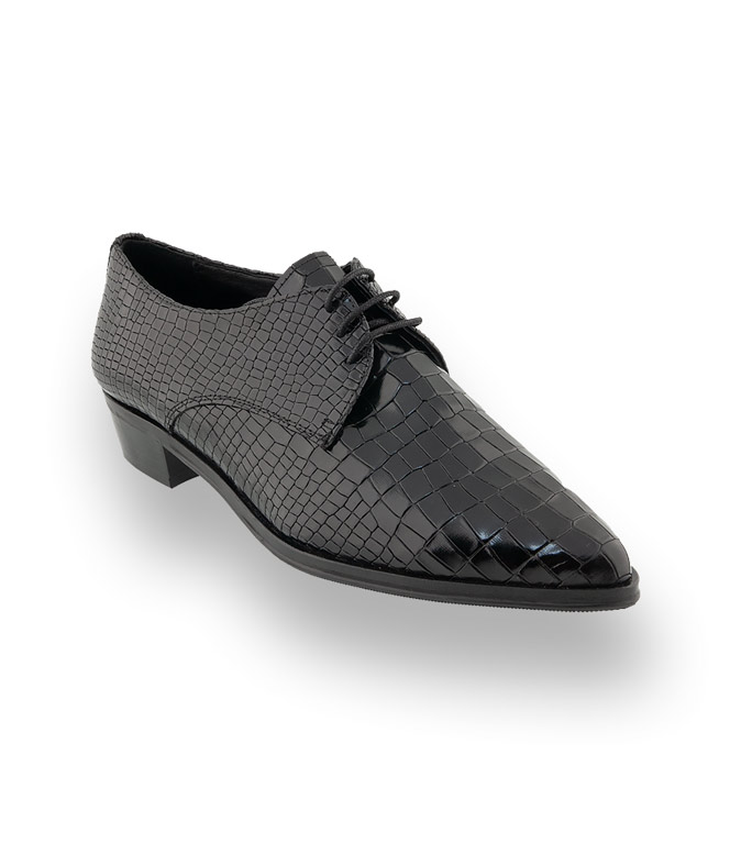 Maskuline Schnürer sind die perfekte Ergänzung zum trendigen Hosenanzug und ein It-Piece der neuen Saison. Der spitze Leisten unterstreicht den angesagten Look. Schwarzes Kroko geprägtes Kalbsleder und hochwertiges Lederfutter bieten optimalen Tragekomfort.