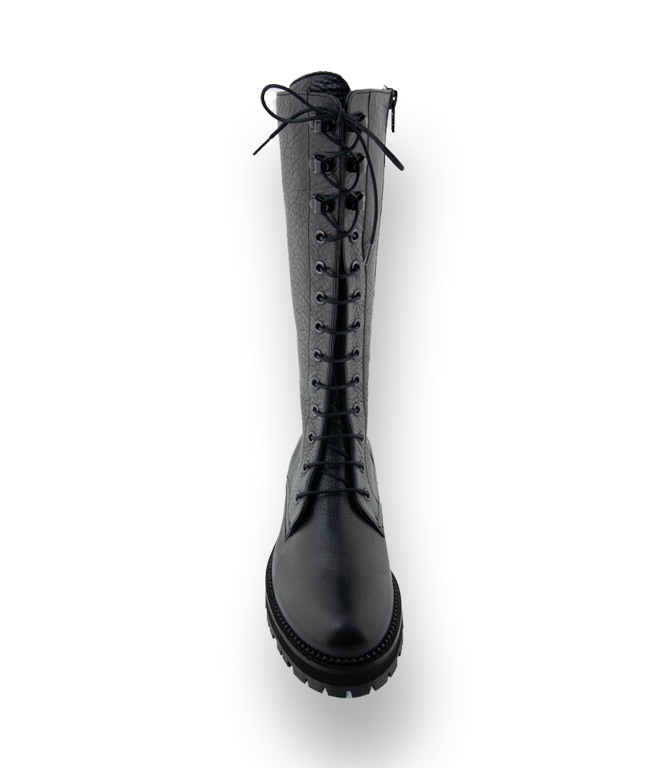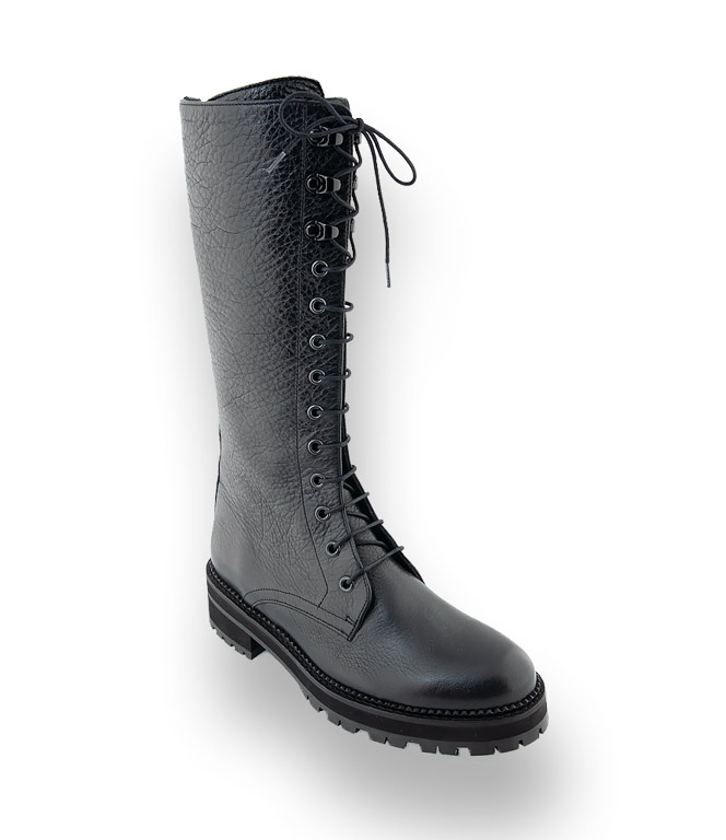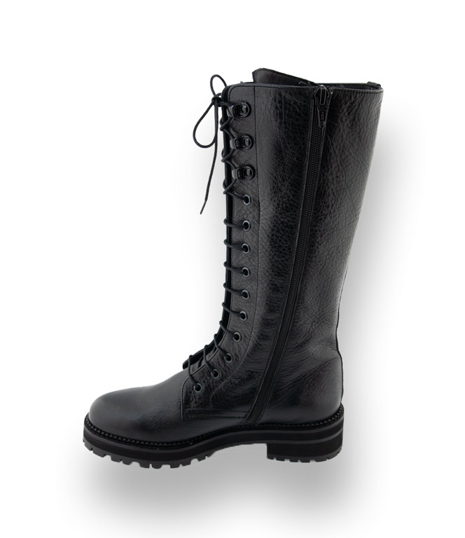 Schwarze Booties mit derber Profilsohle von Pertini vervollständigen den angesagten Look. Der Springerstiefel überzeugt durch genarbtes Kalbsleder und weiches Lederfutter. Durch die Schnürung kann der Stiefel der Wade angepasst werden. Der seitliche Reißverschluss ermöglicht einen leichten Einstieg.