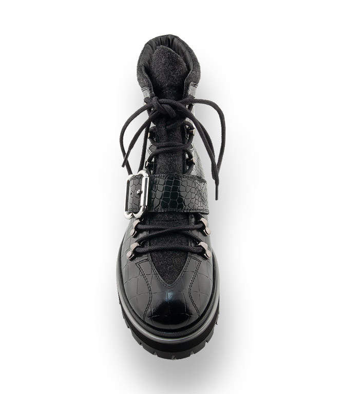 Pertini macht aus dem klassischen Bergsteiger ein Fashion-Highlight. Schwarzes Kroko geprägtes Kalbsleder wurde mit effektvollem Filz ergänzt. Edle Ösen, die dekorative Schließe und der sichtbare, farblich abgesetzte Rahmen stechen sofort ins Auge. Grobe Profilsohlen sind voll im Trend und machen sogar Schmuddelwetter zum Vergnügen.