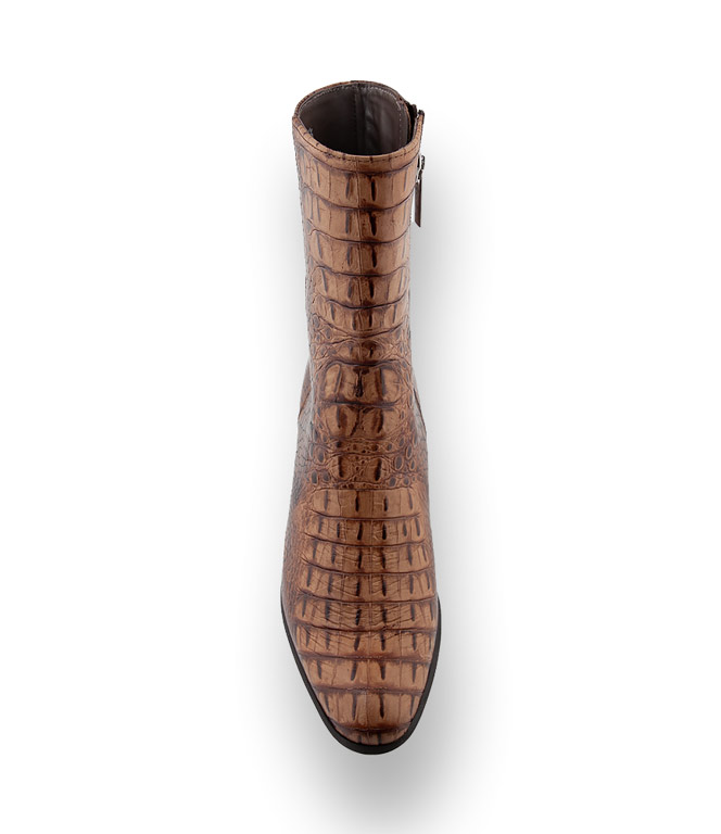 Hochwertiges braunes Kalbsleder in einer stylischen Krokoprägung veredeln jedes Outfit im Nu. Der leicht unterstellte, blockige Absatz und die Gummilaufsohle machen aus der spitzen Stiefelette einen unverzichtbaren Saisonbegleiter. Der seitliche Reißverschluss ermöglicht einen leichten Einstieg.