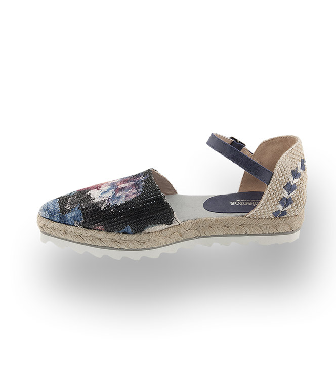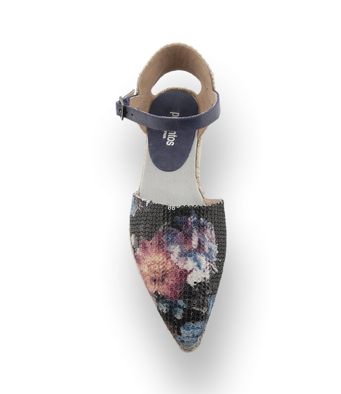 Espadrilles von Pimientos gewinnen nicht nur durch die Hanfsohle in der Kombination mit weißen Haifischzähnen an Attraktivität. Sie glänzen mit Blütenpracht in taubenblau, mit rosé auf einem spitzen Leisten. Pailletten leuchten hervor und strahlen in der Sonne. Das Vorderblatt ist mit Leder gefüttert und auf einer Leinendecksohle lässt es sich bequem verweilen. Die hübsch bestickte Ferse mit blauem Riemen sorgt für den nötigen Halt.