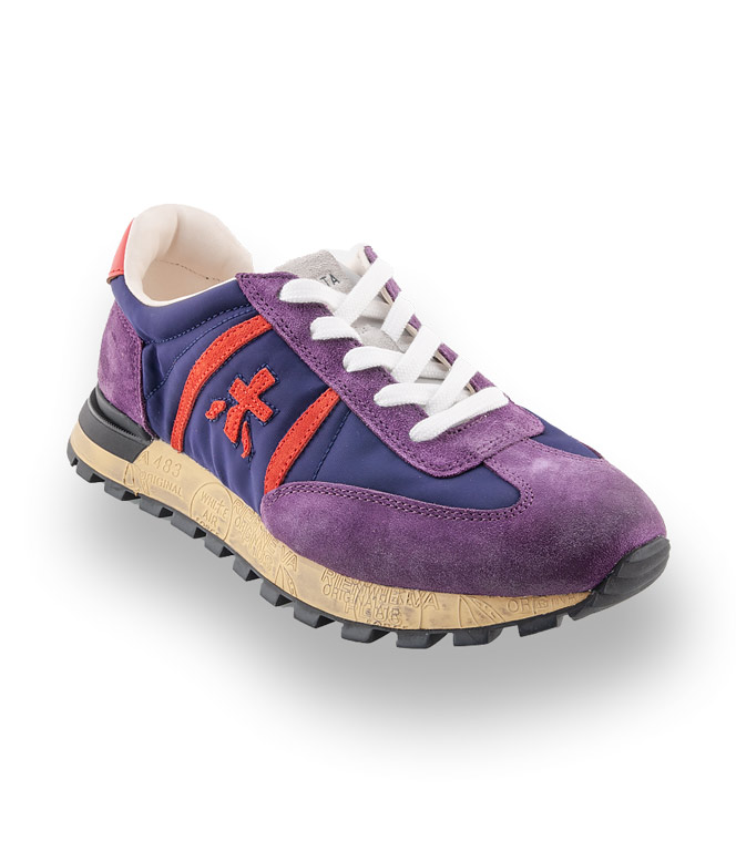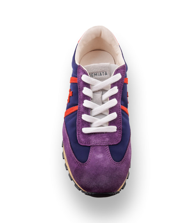 Eine Frischekur von Premiata. Blauer Stoff und violafarbenes Veloursleder und Details in rot, wirken erfrischend und peppen ihren Casual-Style. Traumhaft leicht und weich mit Lederfutter und einem austauschbaren Lederfußbett gehen Sie sportlich in die neue Saison. Lassen Sie sich anstecken von den jungen Sneakern und ihre Sammelleidenschaft ist geweckt. Neuer Boden, extra weich und flexibel.