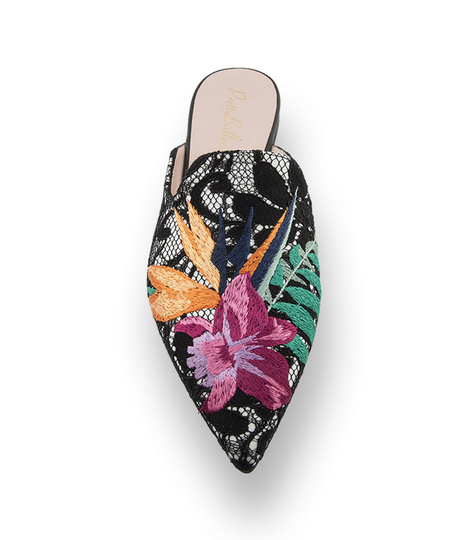 Pretty Ballerinas - Mule in schwarze Spitze mit bunter Stickerei
