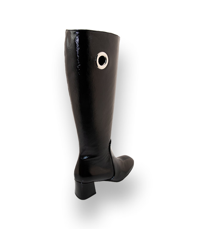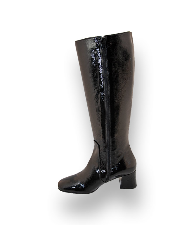 An den Modestil der späten 60er und der frühen 70er erinnern Mini-und Maxiröcke und legere Kleiderformen. Der Stiefel aus schwarzem Knautschlack von T-Progetto begeistert durch Material und modische Details wie silberfarbene Öse, Karreeform und stylischer 5cm hoher Blockabsatz. Lederfutter erhöht den Tragekomfort und ein Reißverschluss garantiert einen bequemen Einstieg.