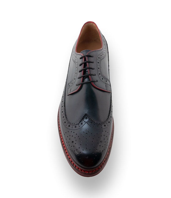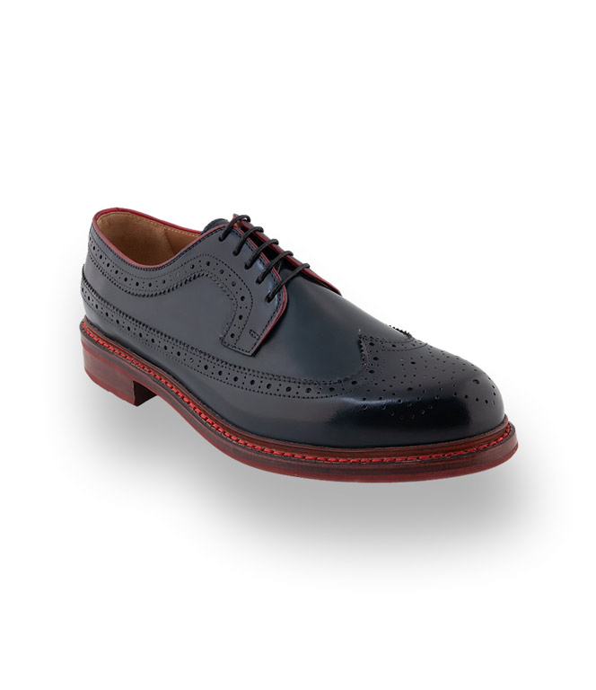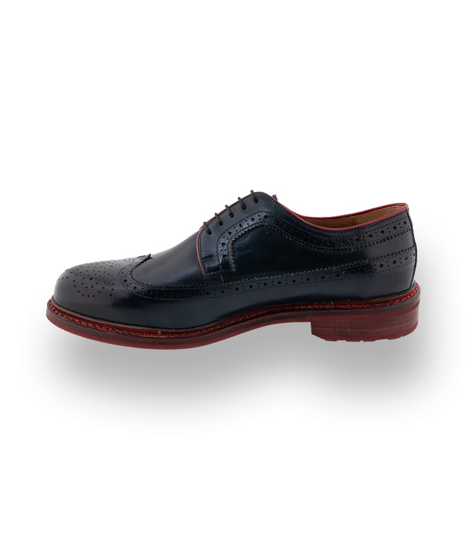 Zeitlos und schick ist der blaue Schnürschuh aus hochwertigen Kalbleder. Dieser edle rahmengenähte Derby ist mit Leder gefüttert und mit einer rot eingefärbten Gummisohle mit Profil versehen. Ein Klassiker von Quarvif für den Mann mit hohen Ansprüchen. Schick zum Anzug, zur Kombination und durchaus zur Jeans tragbar. Wer gehobene Klassik liebt, für den ist dieser Schuh ein wertvoller Begleiter.