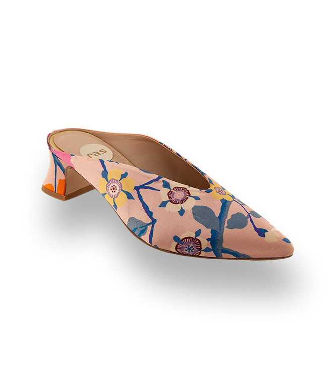 Bunter Mix auf Satin, verspielt und feminin zeigt sich der Mules von RAS. Schmetterlinge und Blumen tummeln sich auf rosa Seide. Spitzer Leisten und der raffinierte Absatz ergeben einen wirkungsvollen Eyecatcher für ihren individuellen Streetstyle. Weiches Lederfutter und eine Lederlaufsohle zeugen von hoher Qualität.