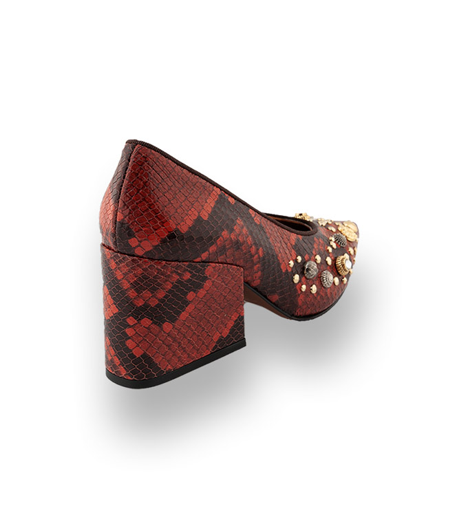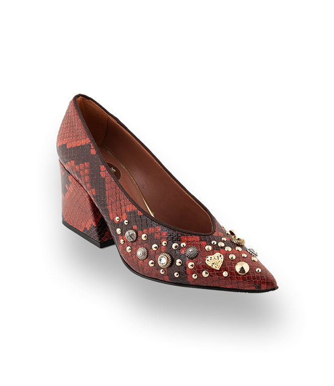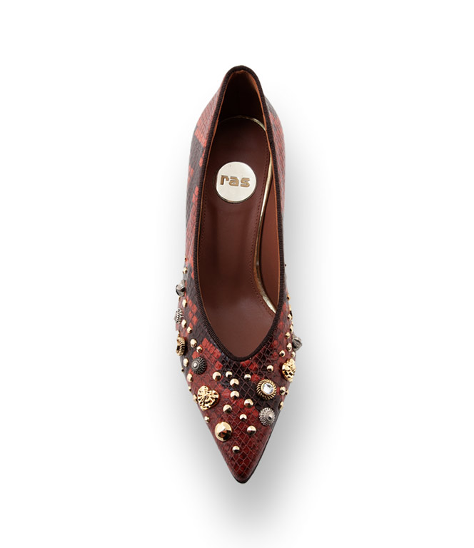Schlangenoptik in rostbraun, die spitze Kappe und vorallem der modische 6cm hohe Absatz peppt ihr herbstliches Outfit. Schicker Pumps von RAS wird zum Highlight in ihrem Schuhschrank. Ein unkomplizierter Stylingpartner für modisch aufgeschlossene Frauen. Qualität sorgt für perfekten Tragekomfort. Hochwertiges Lederfutter und eine Gummilaufsohle schützt vor Nässe und ist weich und flexibel. Nieten, Herzchen und Schmucksteine zeigen Wirkung. Eine Eyecatcher auf dem herbstlichen Parkett.