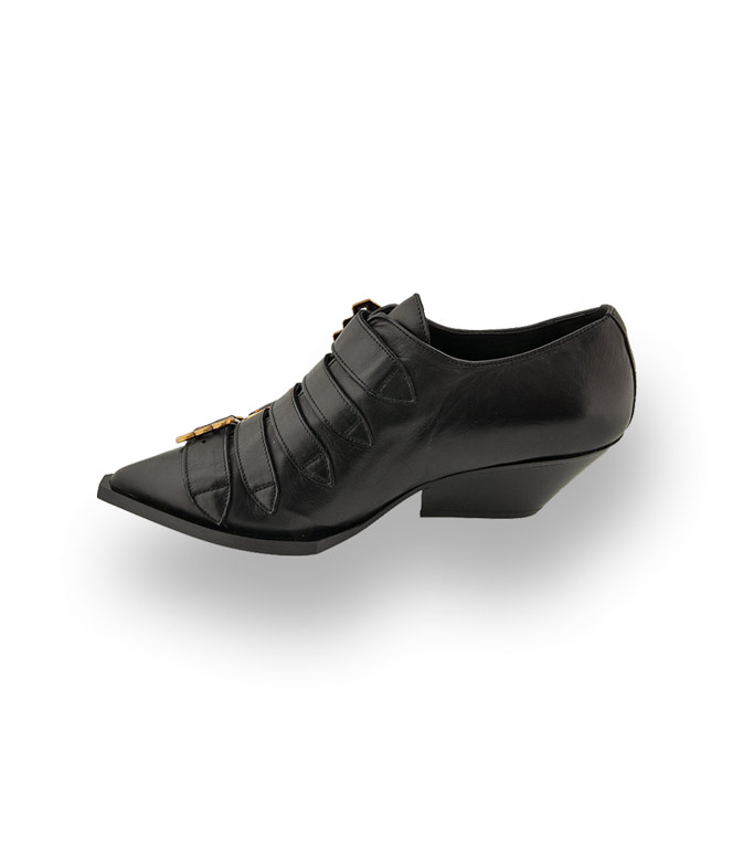 Ein Schuhwahnsinn im Western-Style. Cool interpretiert und perfekt auf die neuen Hosenformen abgestimmt. Die schwarze Hochfront-Slipper von RAS mit dem extrem unterstellten Absatz von 4,5cm wird durch 5 trendige, goldfarbene Schnallen zum modischen Highlight. Aus hochwertigem Kalbsleder mit Lederfutter und einer Gummilaufsohle sind die Modern-Cowgirl-Schuhe von Ras Trendsetter der Saison. Die Karree-Sohle in der Kombination mit spitzer Kappe vervollständigt das junge Design. Ausschweifende Lifestyles RAS Made in Spain.