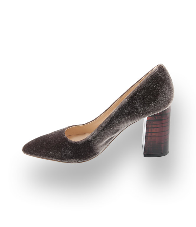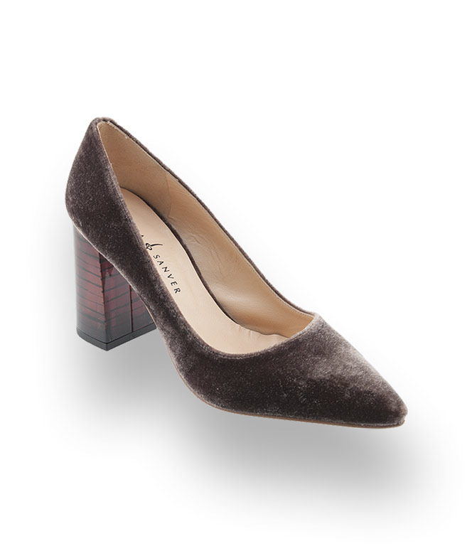 Der Edelstoff Samt erobert die Daywear. Rebecca Sanver schmückt diesen spitzen Pumps in Nougat mit einem extravaganten 7,0 cm Blockabsatz aus braunem Plexiglas. Schlicht und trotzdem umwerfend im Design und Verarbeitung. Die Lederlaufsohle und das Lederfutter sorgen für ein angenehmes Klima im Schuh. Rebecca Sanver kompletiert den angesagten Look in Samt. Selbst Hosenanzüge erhalten durch dieses Material eine feminine Note und der Schuh vervollständigt das neue Outfit.