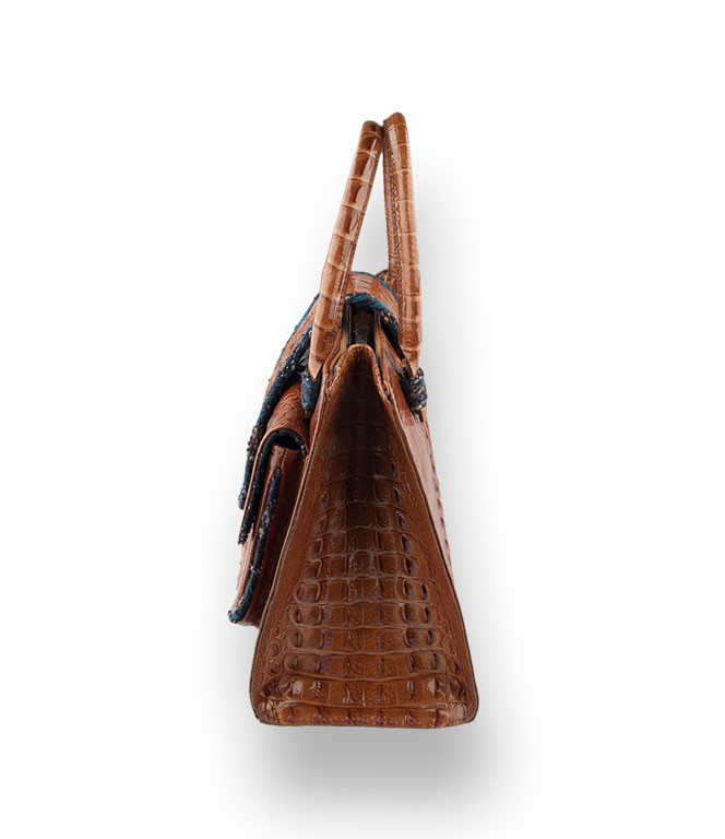 Das Highlight der Designertasche ist die Paspellierung in blau/türkis. Aus Tweed mit Metallfäden durchwirkt. Selbst das Innenleben wurde farblich dazu abgestimmt. Das Ergebnis ist ein wertvolles, elegantes und langlebiges Objekt.