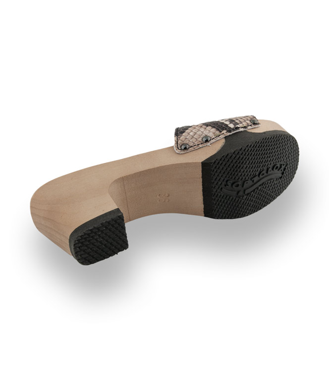 Die Bandage aus schlangengeprägtem Kalbsleder bietet sicheren Halt. Der leichte Holzboden mit fexiblem Gummieinsatz wird sie begeistern. Die Gummilaufsohle dämpft ihre Schritte und sorgt für einen leisen Auftritt. Softclox sind eine Wohltat für die Füße und der optimale Begleiter für heiße Sommertage.