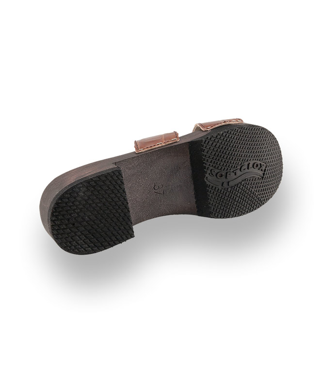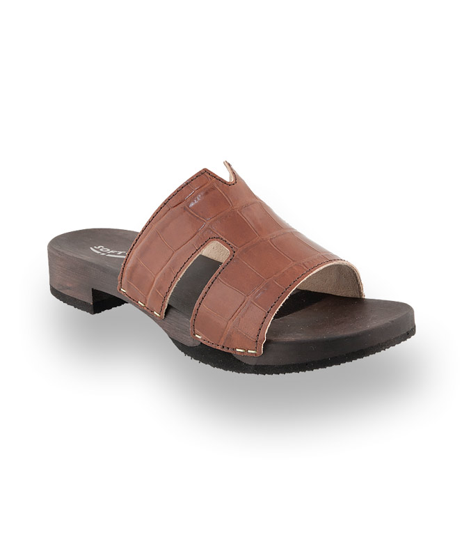 Leichtes Holz und krokogeprägtes Kalbsleder sind eine Wohltat für die Füße. Die markante Bandage bietet sicheren Halt. Der biegsame Boden mit Gummilaufsohle dämpft ihre Schritte.