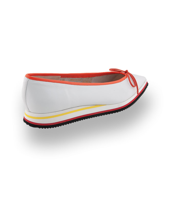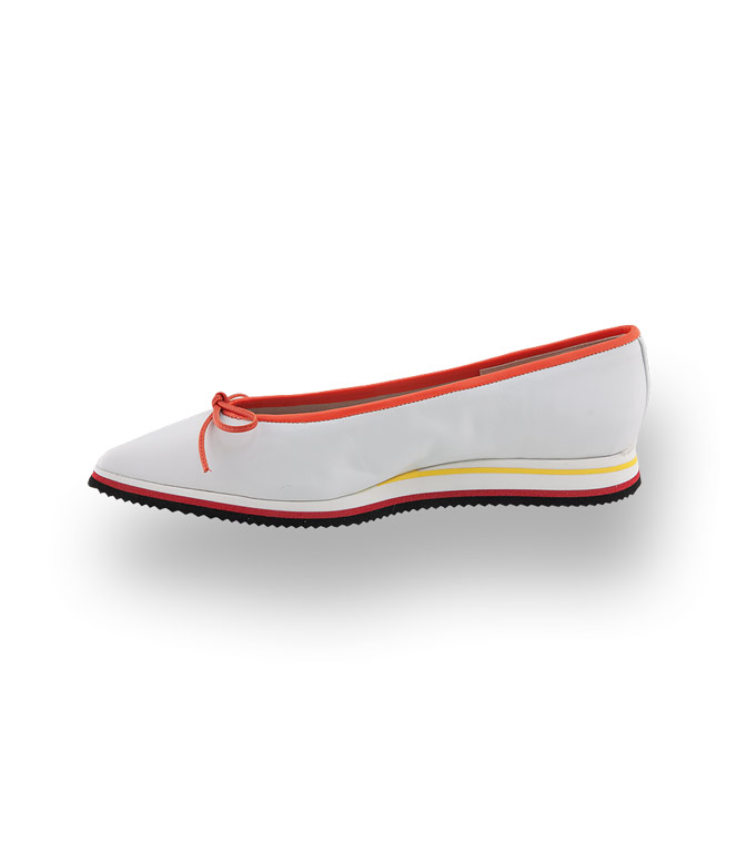 Weißes Kalbleder wurde mit orangefarbem Paspol und kleiner Schleife aufgepeppt. Der federleichte Keil mit den pfiffigen Streifen dämpft ihre Schritte und unterstützt den hohen Tragekomfort. Das ungefütterte Modell sitzt wie angegossen und ist nur an Ferse und Spitze verstärkt.