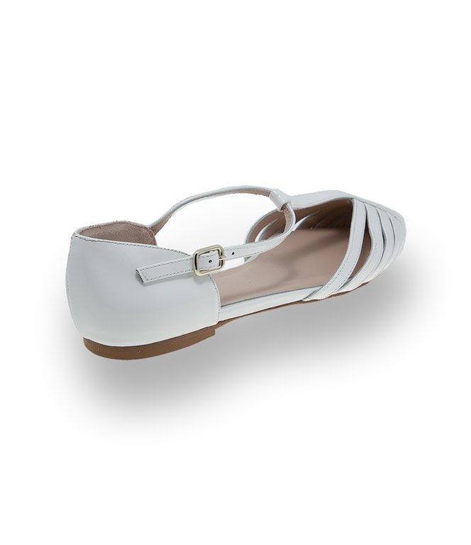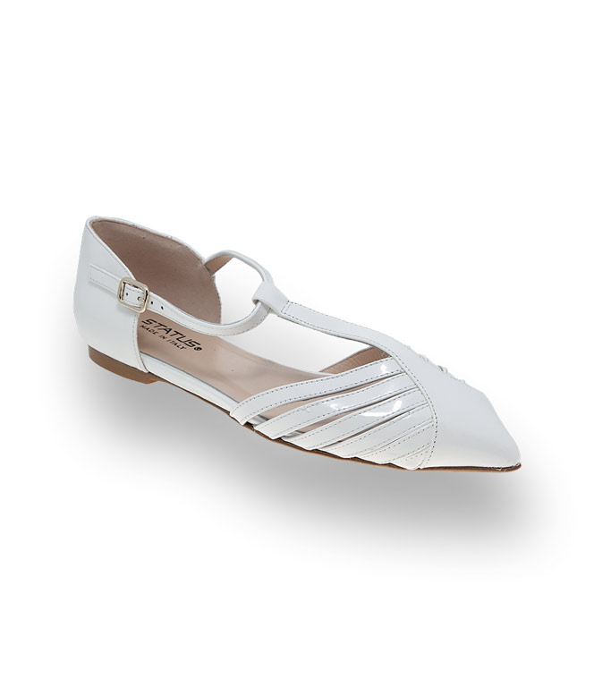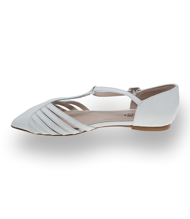 Der weisse Ballerina mit seitlicher Öffnung und T-Spange ist unaufdringlich und grazil. In spitzer Form aus Lackleder wird dieses Modell zum Glanzstück in ihrem Schuhschrank. Hübsche Riemchenanordnung, Lederfutter wie Lederlaufsohle garantieren perfekte Passform und Komfort auch bei hohen Temperaturen. Ein Kombinationstalent muss in den Warenkorb.