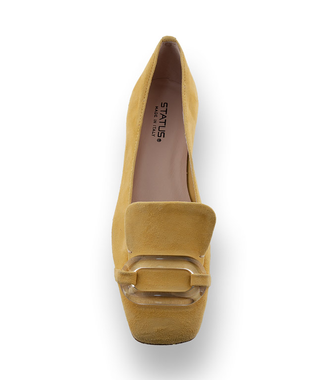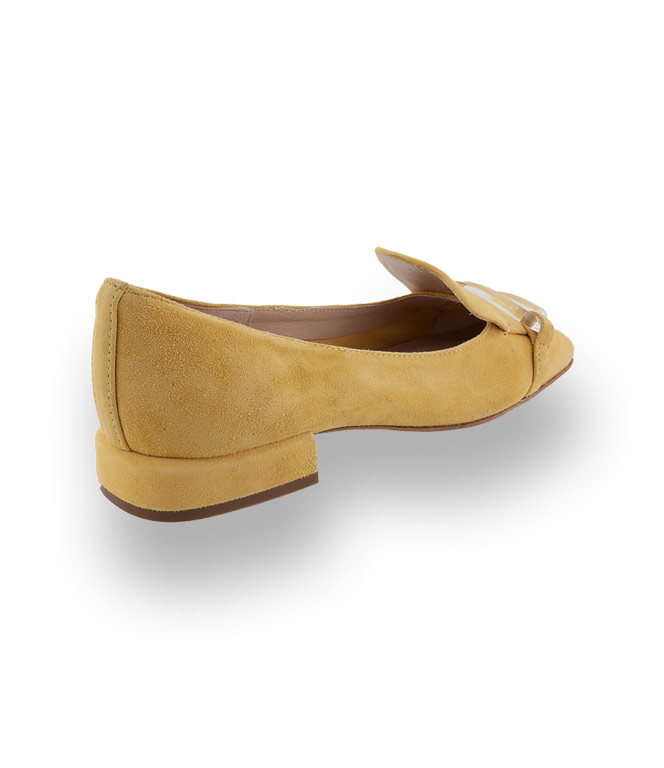Der edle Loafer ist aus gelbem - butterweichem Velour gefertigt. Die Kappe mit hochgezogene Lasche und trendiger Karreespitze wurden mit einer eleganten Acrylglasbrosche in Szene gesetzt. Der ungefütterte Loafer ist mit Leder eingefasst, an Ferse und Kappe verstärkt und sitzt wie angegossen. Der kleine Absatz und die Lederlaufsohle sorgen für einen hohen Tragekomfort.