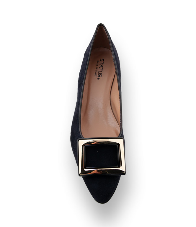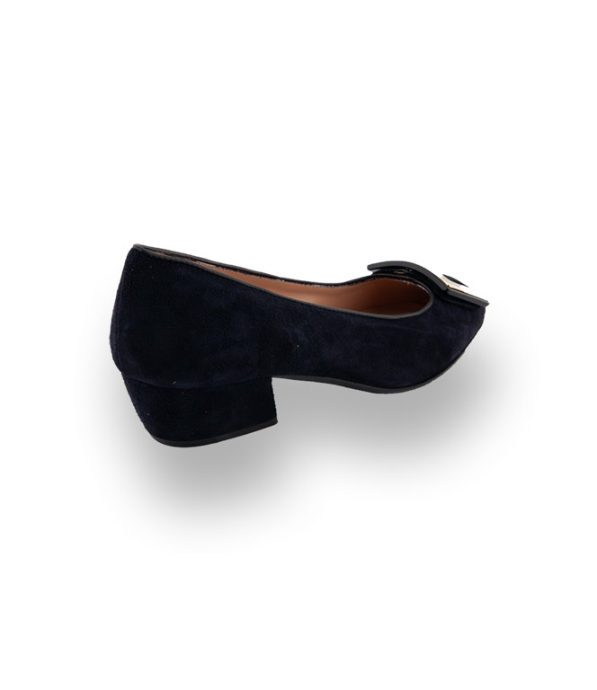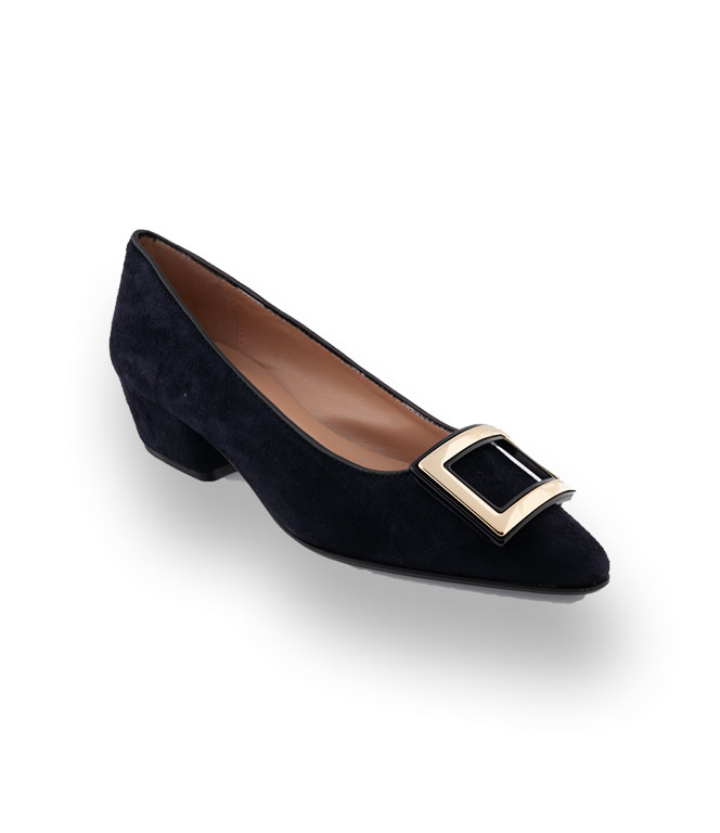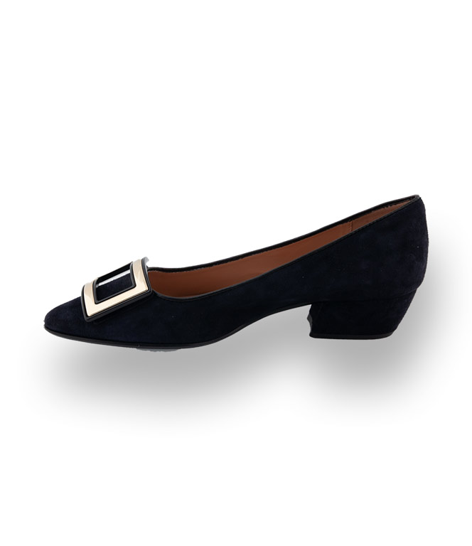 Weiches Veloursleder und Kalbslederfutter verwöhnt ihre Füße. Die spitze Form harmoniert perfekt mit dem leicht unterstellten, Lederbezogenen Absatz. Eine imposante, goldfarbene Schließe, mit schwarzem Rand schmückt das Blatt. Die Paspellierung aus schwarzem Leder unterstreicht den eleganten Look.