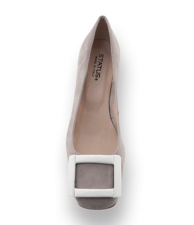 Butterweiches hellgraues Velour wurde mit einer imposanten, quadratischen Brosche in weißem Lack aufgepeppt.Die angesagte Karreespitze harmoniert perfekt mit dem konischen, unten etwas breiterem, Blockabsatz. Der ungefütterte Pumps ist mit Leder eingefasst, an Ferse und Kappe verstärkt und sitzt wie angegossen. Lederdeck und Lederlaufsohle sorgen für einen hohen Tragekomfort. Der Pumps veredelt jedes Outfit im Nu.