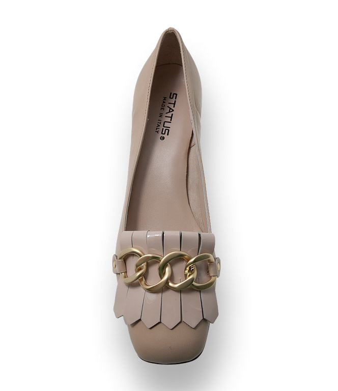 Nudefarbener Trotteur von Status für die City-Uniform. Leicht kombinierbar, traditionell, klassisch schick. Ein Allrounder der ihre Garderobe stilvoll ergänzt. Das Modell in modischer Karreeform mit Fransenlasche überzeugt durch hübsche Details wie eine dekorative Gliederkette und in der Kombination von Lack- und Glattleder höchst eindrucksvoll. Ein bequemer 5cm hoher Absatz und eine Ledersohle machen den Pumps zum idealen Begleiter an arbeitsintensiven Tagen.
