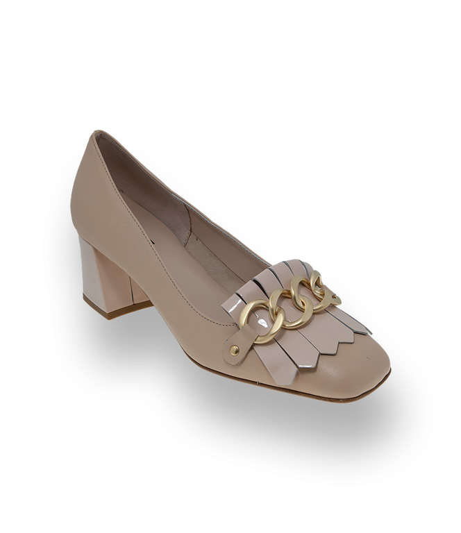Status Pumps in nudefarben mit Fransenlasche aus Lack und Metallkette
