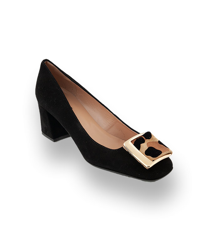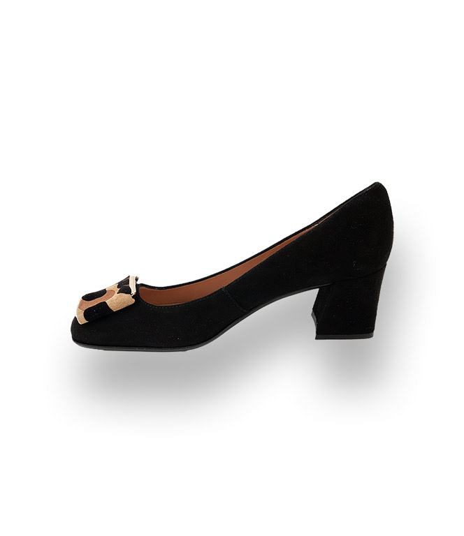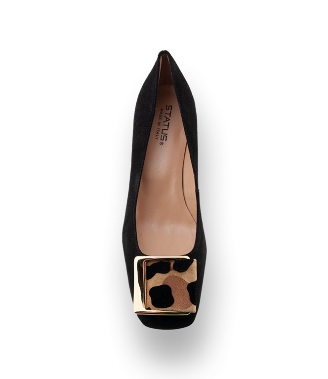 Status Pumps in schwarz velours mit Brosche im Animalprint
