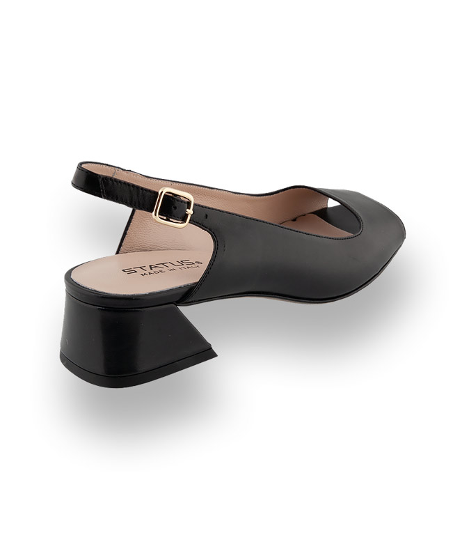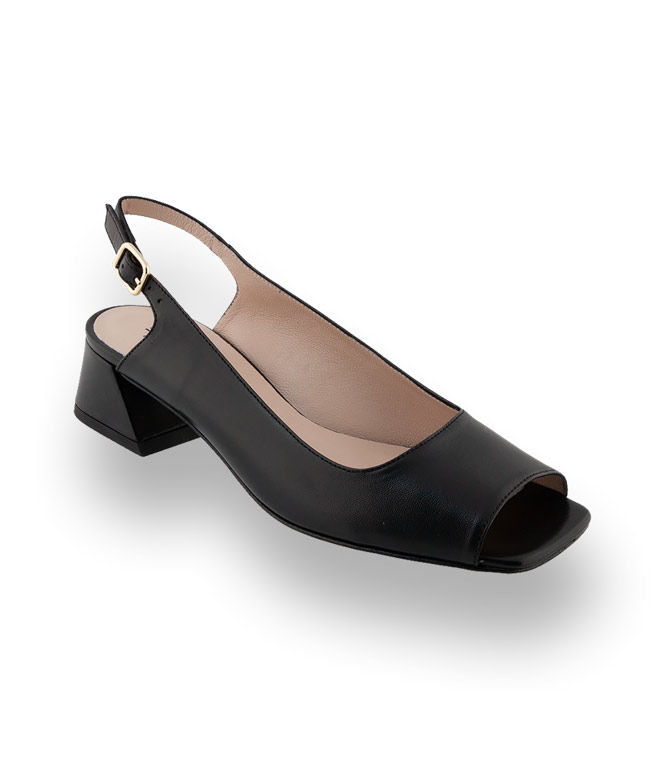 Schwarzes Kalbsleder und Lederfutter verwöhnt ihre Füße. Das glatte Blatt und der bequeme Ausschnitt machen das Modell zu einem perfekten Sommerbegleiter. Angesagtes Karree und der konische, nach unten etwas breiter, Blockabsatz stechen sofort ins Auge. Den verstellbaren Riemen schmückt eine goldfarbene Schließe.