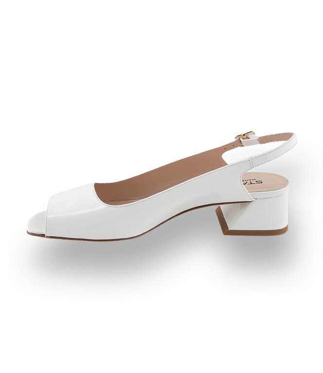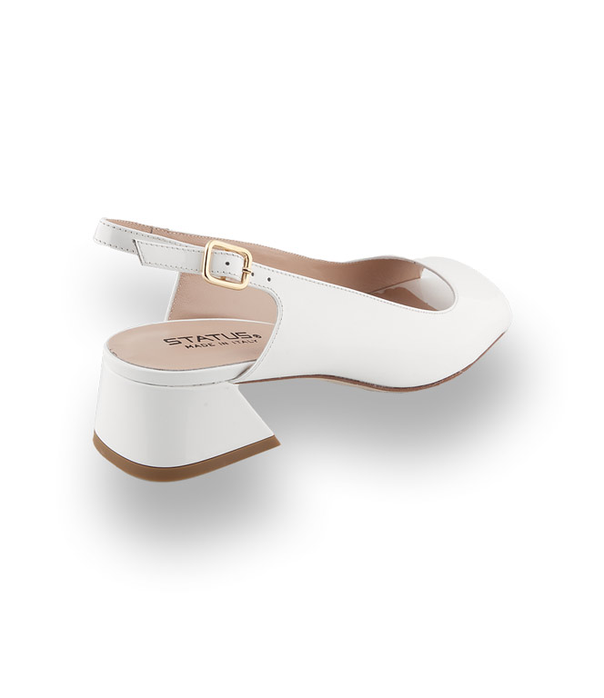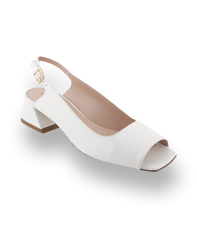Weißes Kalbslack und Lederfutter verwöhnt ihre Füße. Das glatte Blatt und der bequeme Ausschnitt machen das Modell zu einem perfekten Sommerbegleiter. Angesagtes Karree und der konische, unten etwas breitere, Blockabsatz stechen sofort ins Auge. Den verstellbaren Riemen schmückt eine goldfarbene Schließe.
