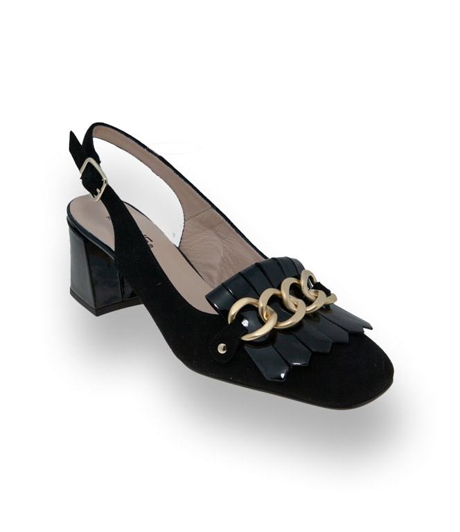 Leicht kombinierbar, traditionell, klassisch schick. Ein Allrounder der ihre Garderobe stilvoll ergänzt. Das Modell in modischer Karreeform mit Fransenlasche überzeugt durch hübsche Details wie eine dekorative Gliederkette und in der Kombination von Velour- und Lackleder höchst eindrucksvoll. Ein bequemer 5cm hoher Absatz und eine Ledersohle machen den Slingback zum idealen Begleiter an arbeitsintensiven Tagen.