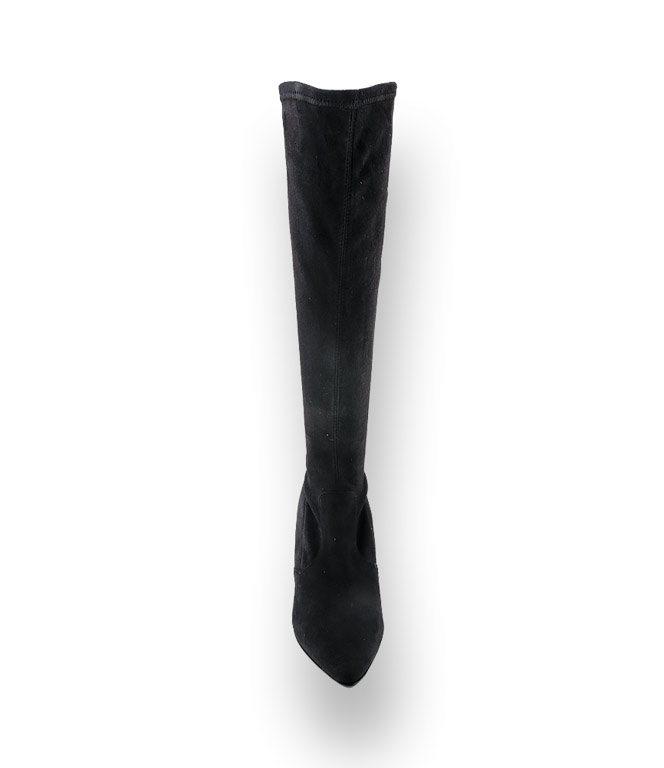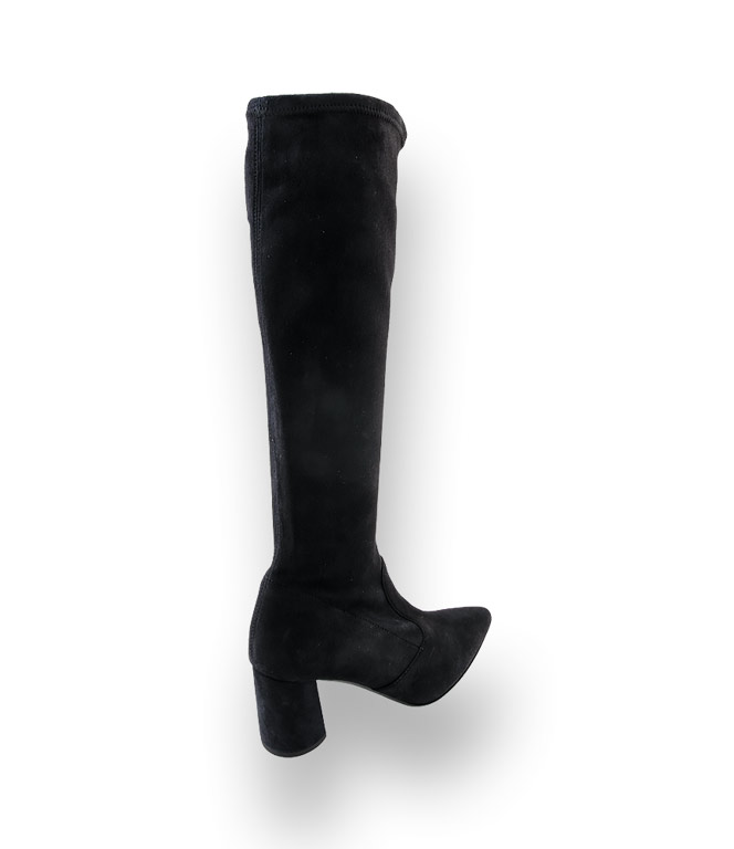 Weiches Stretchvelours umschmeichelt die Wade und sitzt wie angegossen. Der Fußbereich ist Ledergefüttert. Die spitze Form harmoniert mit dem trendigen, Lederbezogenen Säulenabsatz. Die Gummilaufsohle bietet Schutz vor Nässe. Der feminine Stiefel passt pefekt zu den neuen überschnittenen Mänteln.
