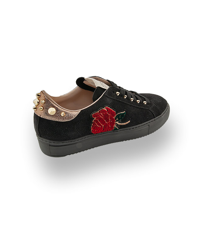 Sneaker sind nicht nur Freizeitschuhe, nein die sportlichen Modelle sind trendige Alleskönner. Sneaker to match your Look. Schwarzes Veloursleder, eine sehr leichte Plateausohle mit austauschbarer Lederinnensohle sorgen für höchsten Tragekomfort. STOKTON das italienische Label verwendet hochwertige Materialien und das Design ist ausdrucksstark und einzigartig. Eine hübsche Rose und goldfarbene Dornennieten highlighten den Trendsetter.