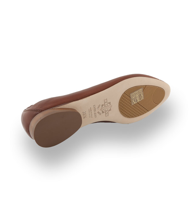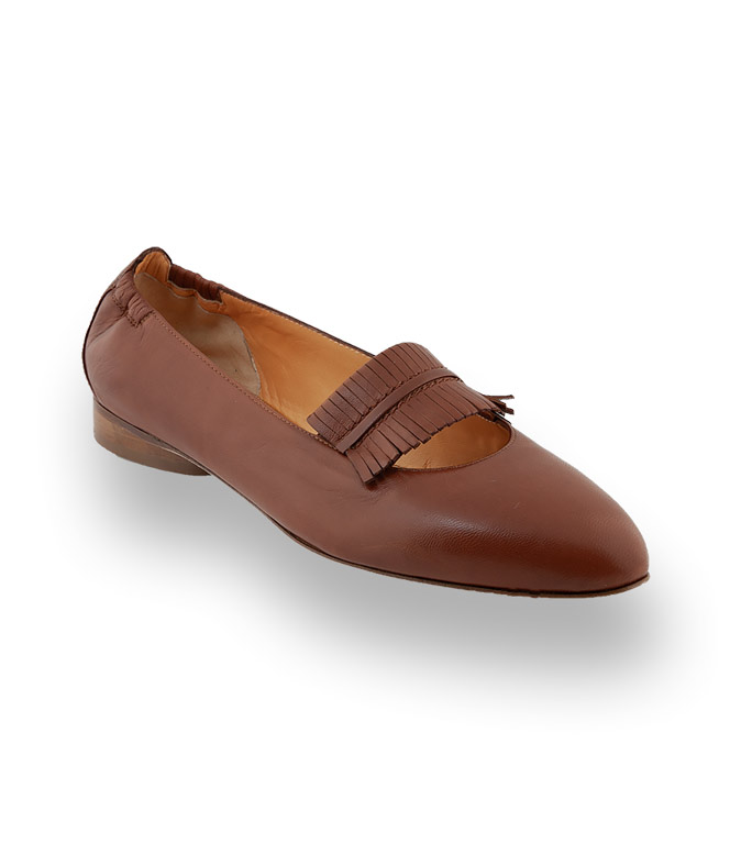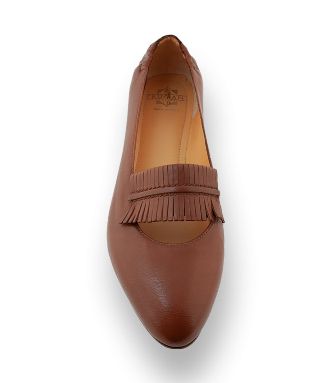 Der braune Ballerina mit der modischen Fransenspange und einem mandelförmigen Leisten wird zum traumhaften Alleskönner. In nobler Sacchetto Machart und aus butterweichem Ziegen-Nappa bekommt man ein Gefühl als ginge man barfuß. Lederfutter und eine Lederlaufsohle mit Gummieinsatz begünstigen den Komfort. Lassen Sie sich überzeugen. TRUMANS handwerkliches Know-How aus Italien für höchste Ansprüche.
