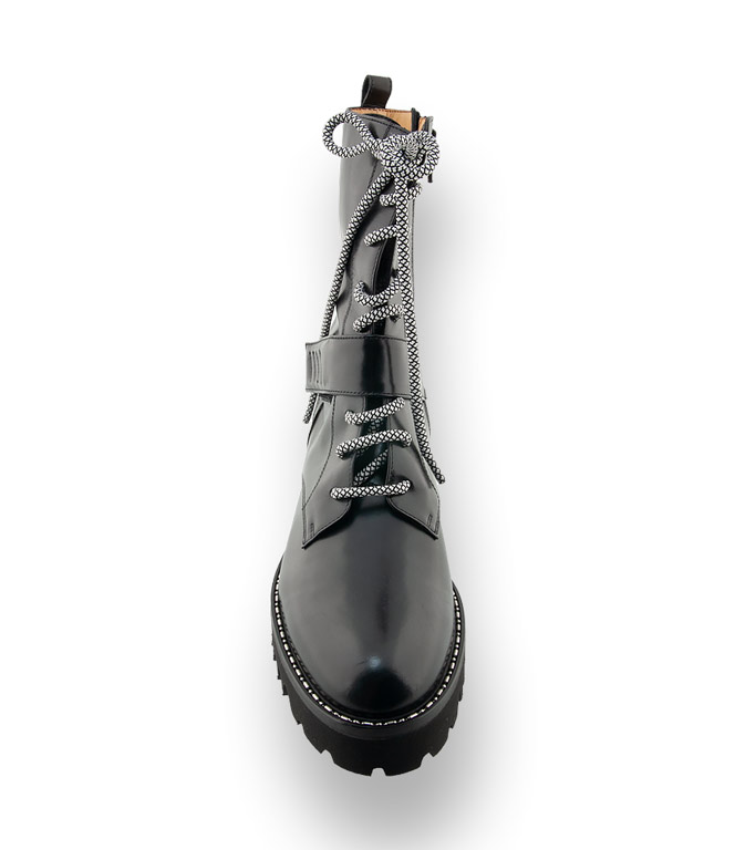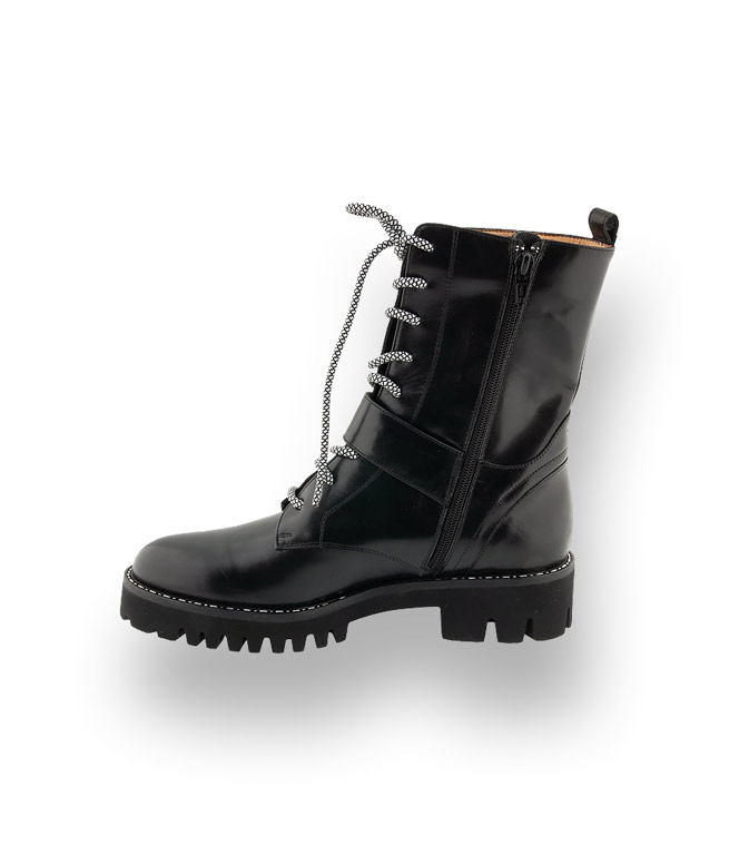 Die schwarzen Booties von Trumans aus edlem Kalbsleder sind mit hochwertigem Leder gefüttert und in bester Verarbeitung in Italien gefertigt. Hohe Handwerkskunst und im sensationellen Design für junge Rebellinnen. Schnürung, Lederriemen und eine Ziernaht am Rahmen sind höchst wirkungsvoll. Ein Reißverschluss sorgt für den schnellen Einstieg.