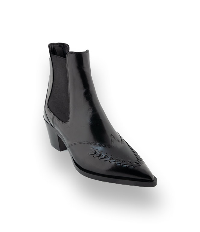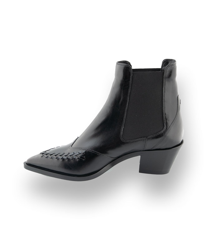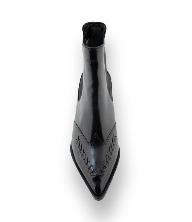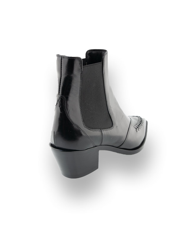 Schwarzer Chelsea-Boots mit einer spitzen Kappe. Die schöne Stickarbeit am Vorderblatt und einem konischen 5cm hohen Absatz findet immer den idealen Einsatz. Elasthaneinsätze erleichtern den Schlupf. Tradition und Handwerk, Design und Qualität zeichnen diesen Bootie vom italienischen Label TRUMANS aus. Zum Hosenanzug, verkürzten Hosen und Kleidern sind Sie mit diesem Chelsea immer perfekt angezogen.