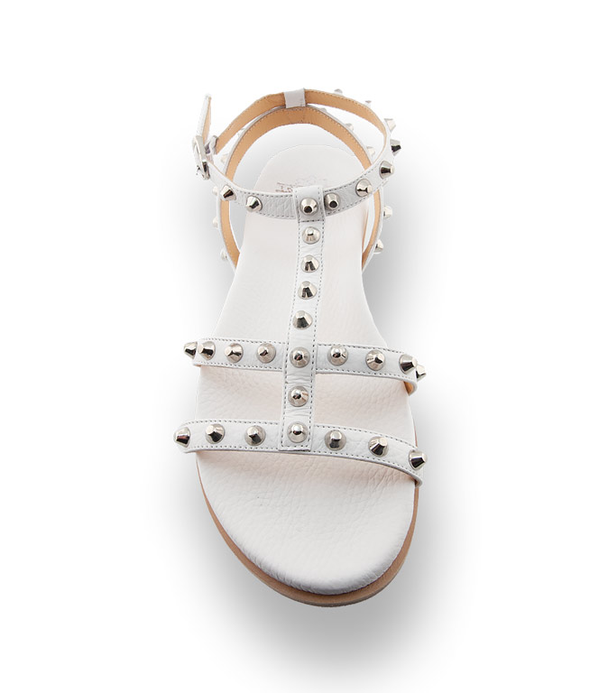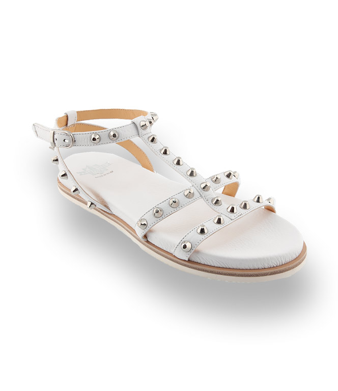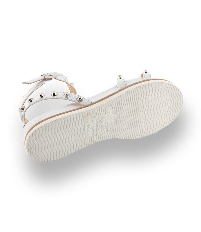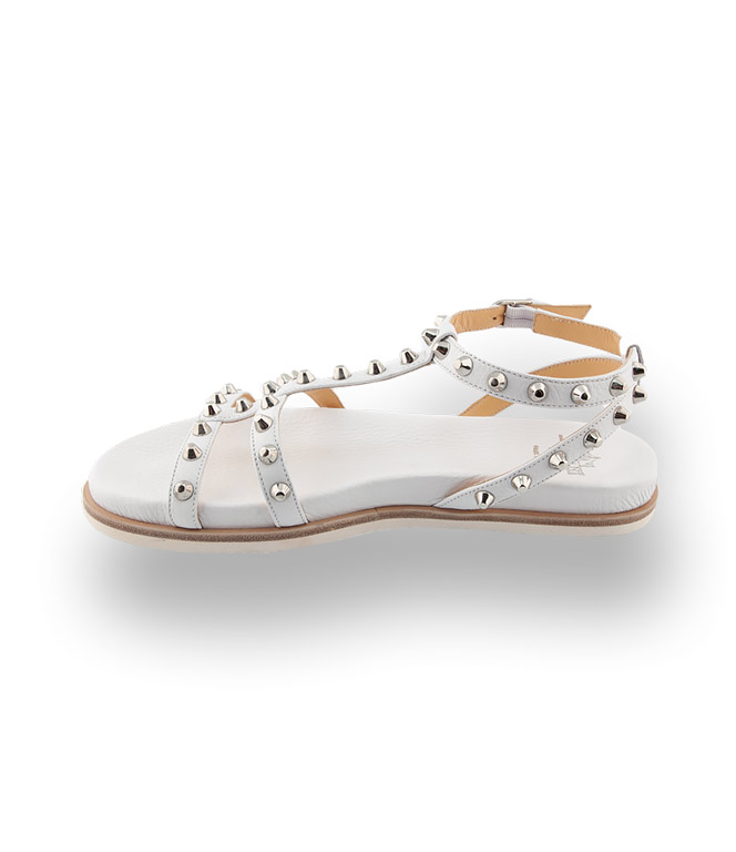 Weisses Kalbsleder mit silberfarbenen Nieten verziert trifft modernen Zeitgeist. Hochwertiges Lederfußbett und eine sehr leichte flexible Gummilaufsohle prägen das Modell und machen es zu ihrem Lieblingsbegleiter mit enormen Wohlfühleffekt. Ein sportliches Stilmittel dass ihre Sommergarderobe peppt. Lassen sie sich überzeugen von der Qualität und Bequemlichkeit.