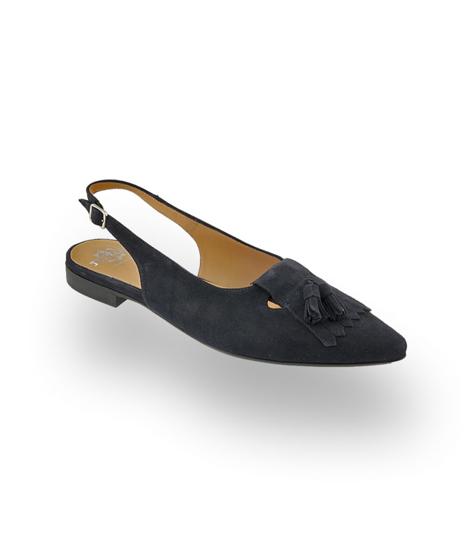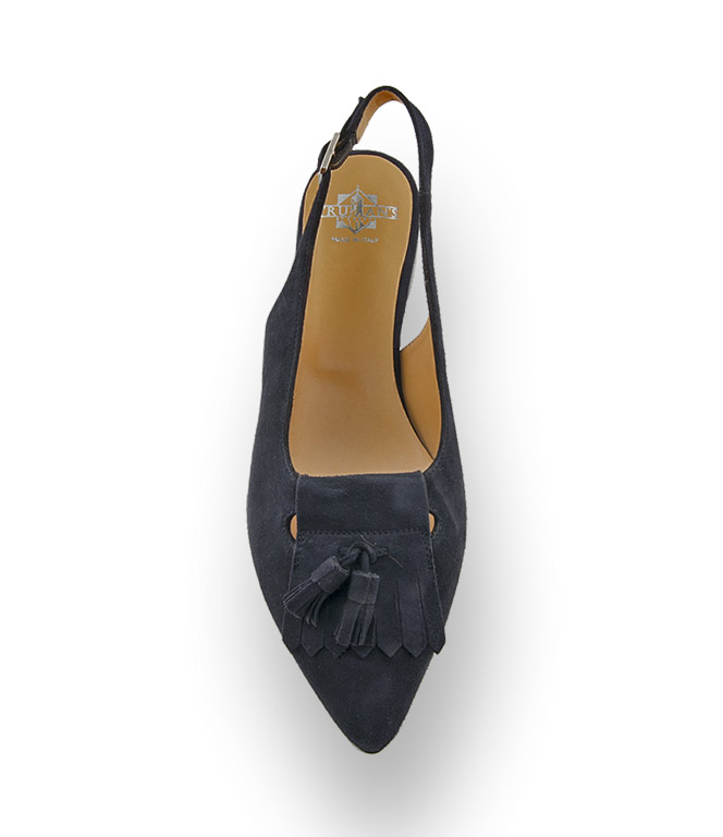 Fransen und Quasten in blauem Nubuk Leder - wie schön und edel kann Klassik sein. Wer Evergreens in hochwertiger Qualität liebt wird bei Trumans immer fündig. Der Sling in spitzer Form mit Lederfutter und Ledersohle garantiert hohen Tragekomfort. Zu verkürzten Hosen, Blusen mit Puffärmeln, organische Stoffe wie Baumwolle oder Sackleinen, ungesäumte Nähte.