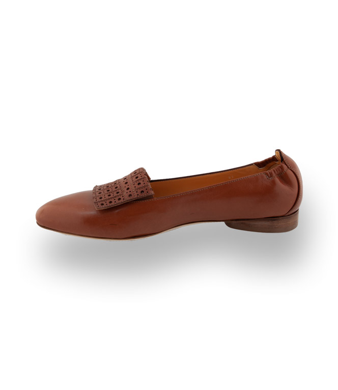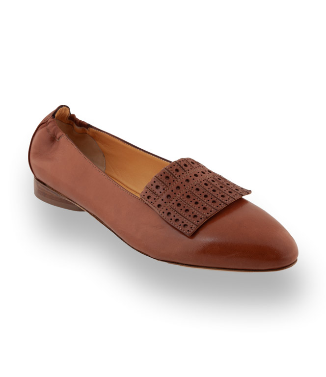 Der braune Ballerina mit der modischen gestanzten Lasche und einem mandelförmigen Leisten wird zum traumhaften Alleskönner. In nobler Sacchetto Machart und aus butterweichem Ziegen-Nappa bekommt man ein Gefühl als ginge man barfuß. Lederfutter und eine Lederlaufsohle mit Gummieinsatz begünstigen den Komfort. Lassen Sie sich überzeugen.