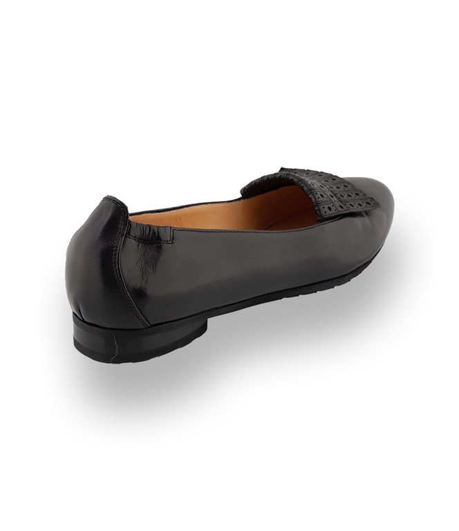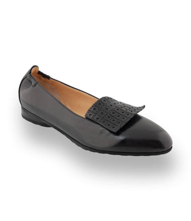 Der schwarze Ballerina mit der modischen gestanzten Lasche und einem mandelförmigen Leisten wird zum traumhaften Alleskönner. In nobler Sacchetto Machart und aus butterweichem Ziegen-Nappa bekommt man ein Gefühl als ginge man barfuß. Lederfutter und eine Gummisohle begünstigen den Komfort. Lassen Sie sich überzeugen.