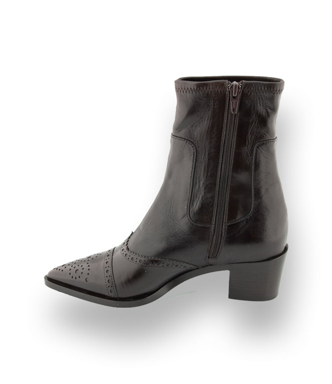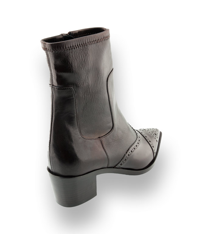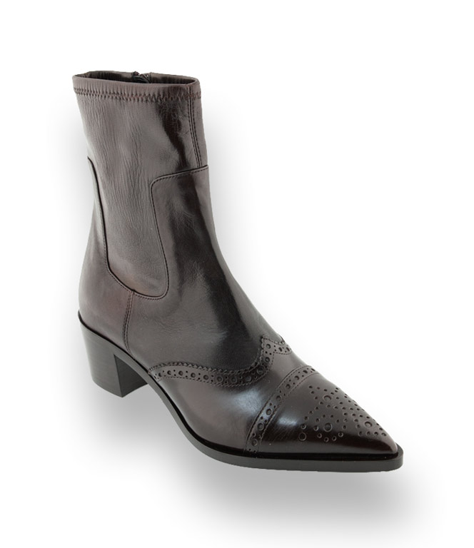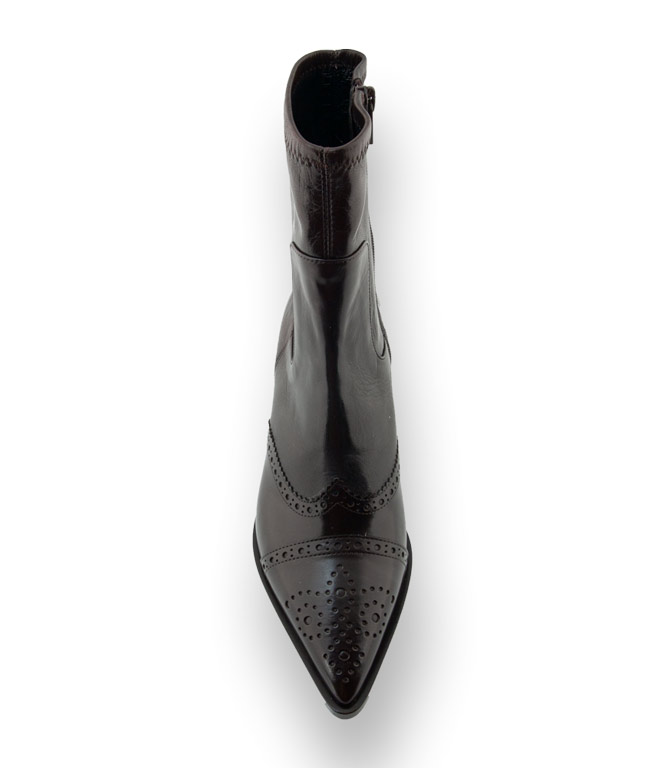 Dunkelbraune Stiefeletten mit Lochlyra und spitzem Leisten sind die absoluten Dauerrenner und können rund um die Uhr getragen werden. Vom Brunch übers Business-Meeting bis hin zum Cocktail. Luxus und hoher Komfortfaktor prägen Stiefeletten von TRUMANS. Geschmeidiger Lederstretchschaft, weiches Ziegennappa und hochwertiges Lederfutter perfektionieren den Tragekomfort. Sowie ein 5cm hoher Blockabsatz und ein Reißverschluss für einen angenehmen Einstieg.