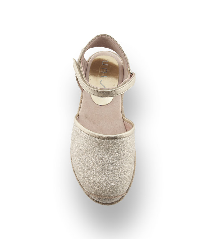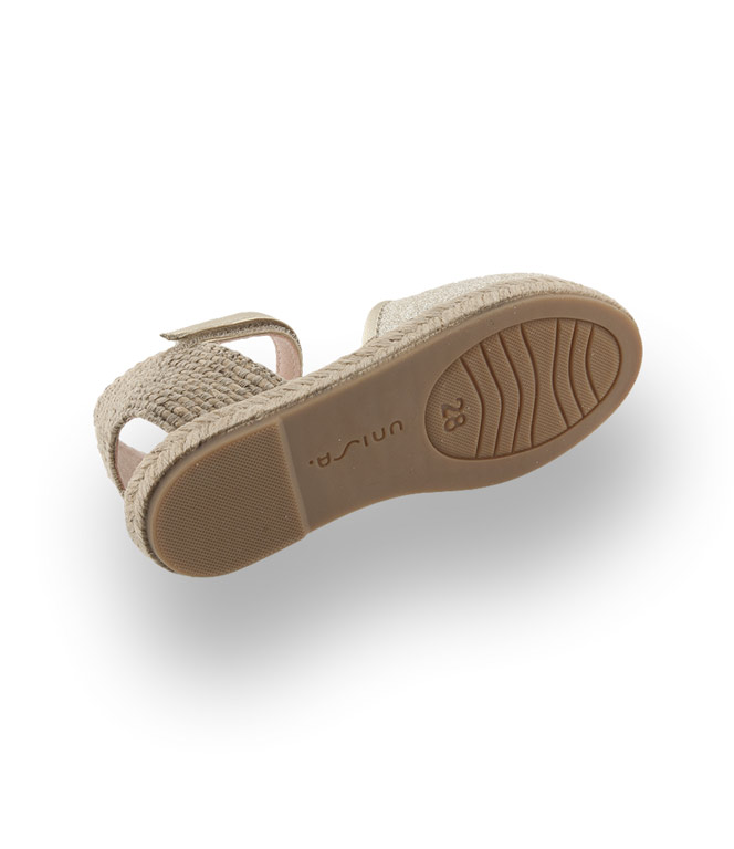 Butterweich und im aktuellen Glitter-Gold glänzt der Espadrillo von Unisa. In hochwertiger Ausführung mit einem kindgerechten Klettverschluss verbringen Mädchen heiße Sommertage auch ohne Söckchen. Ein Lederfutter und eine Lederinnensohle sorgen für ein angenehmes Klima im Schuh. Die geflochtene Hanfsohle wird mit einer Gummilaufsohle ergänzt.