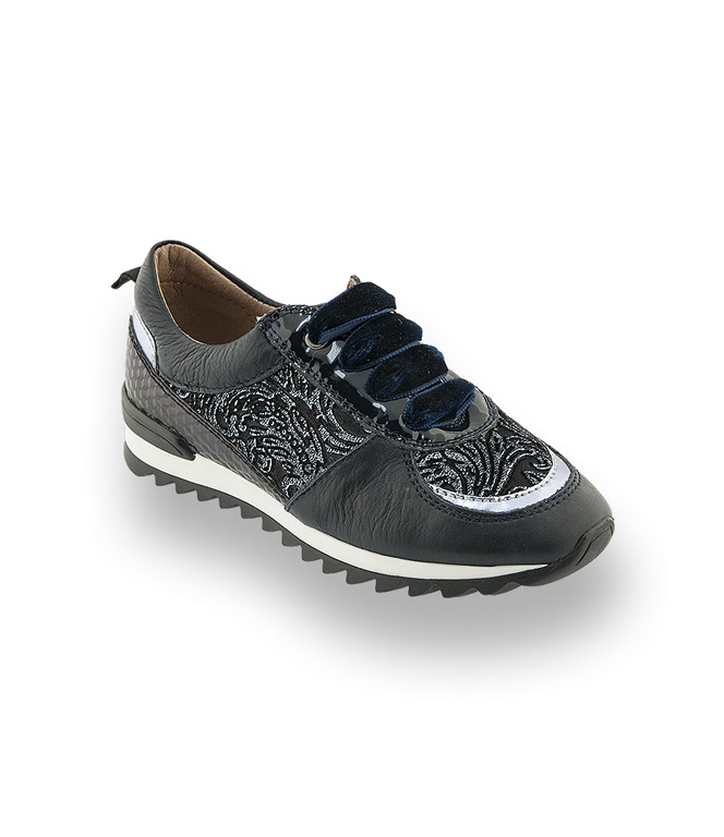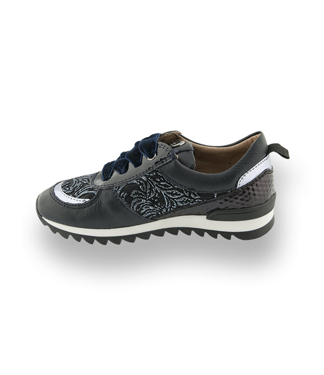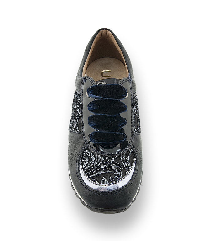 Blaues weiches Leder mit Brokatstoff, Samt und geprägtem Leder bekommt ein hochwertiges Lederfutter und ein Lederfußbett. Die Einlage lässt sich austauschen. Schön im Design und die Kinderfüße werden von UNISA professionell verwöhnt. Weiche Polsterung am Ausschnitt, modische flexible Haifischsohle und Schnürsenkel aus Samt.