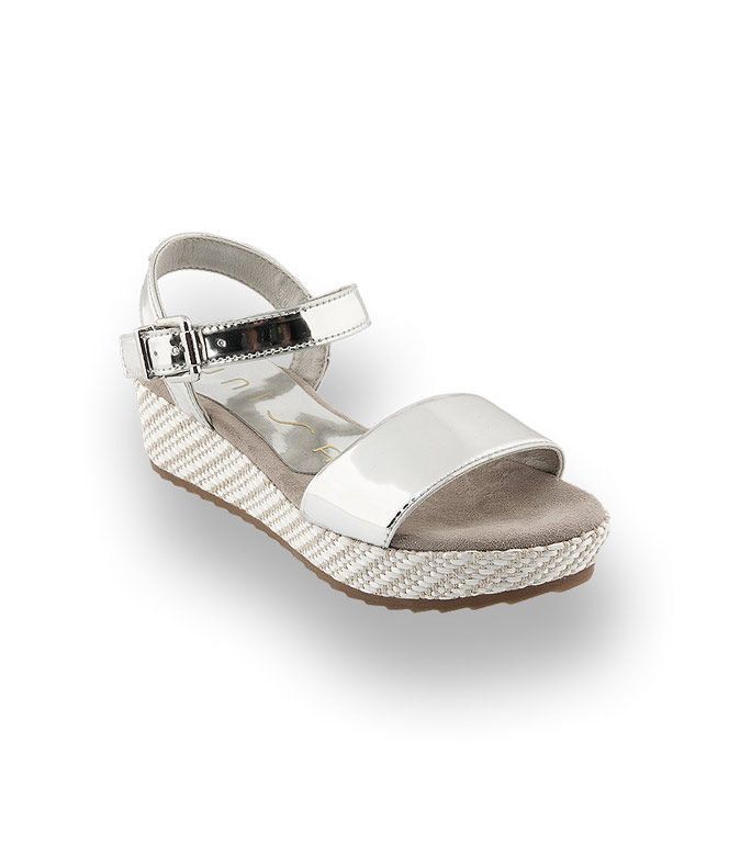 Traumhafte Sandale von UNISA aus silberfarbenen Metallicleder glänzt im Sonnenlicht und die romantischen Kleidchen kommen besonders zur Geltung. Lederfutter und die Decksohle aus Veloursleder verwöhnt die kleinen Füße. Der geflochtene Keil beträgt 2 - auf 3,5cm und ist mit einer Gummilaufsohle verstärkt und lässt sich perfekt abrollen.