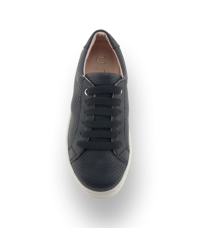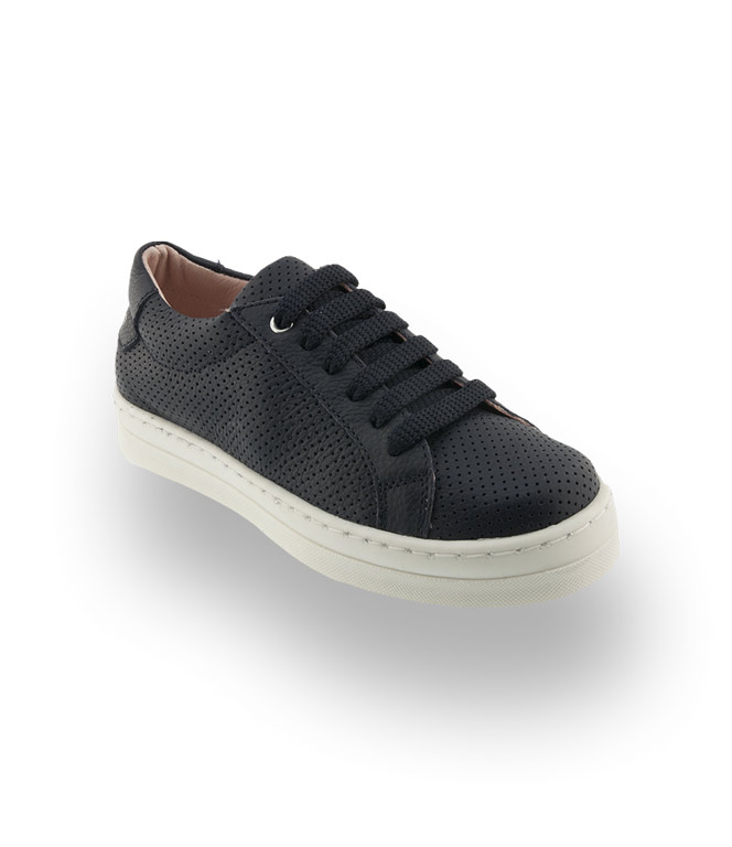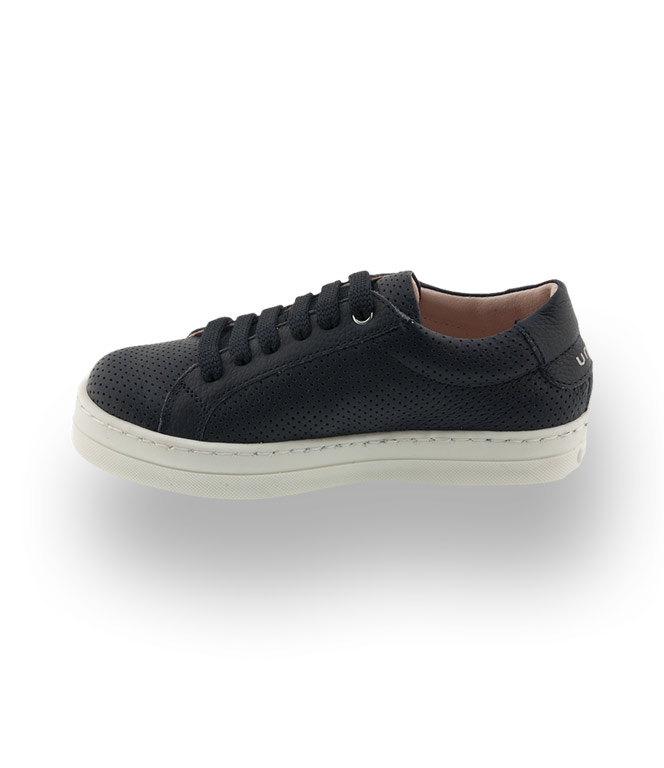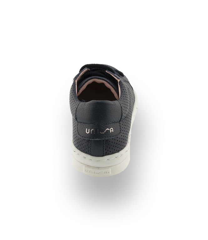 Der dunkelblaue Sneaker von Unisa ist nichts für Stubenhocker. Herrlich weiches Leder mit einem hochwertigen Lederfutter, so werden Kinderfüße professionell verwöhnt. Voll im Trend auch für kleine Leute sind die weißen Plateausohlen. Durch winzige Löcher im Obermaterial bekommt der Sneaker seine sommerliche Wirkung.