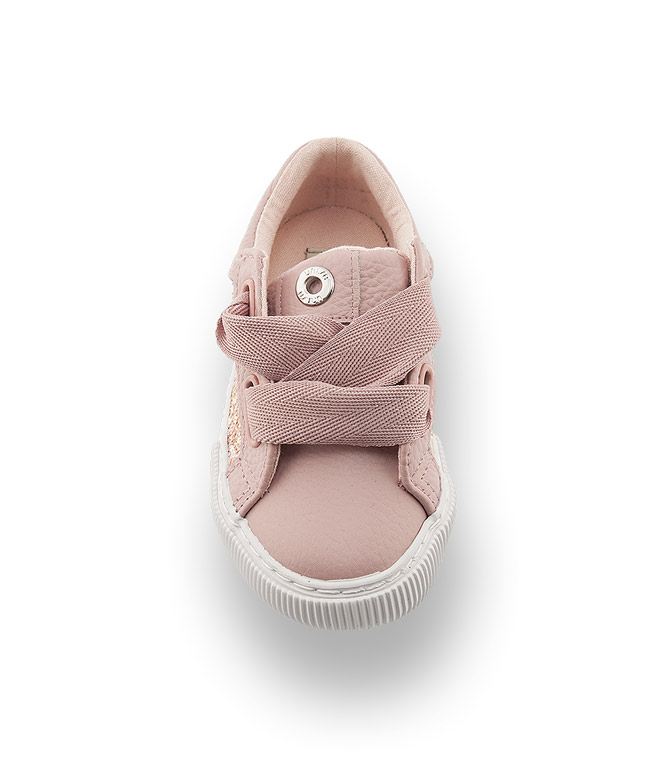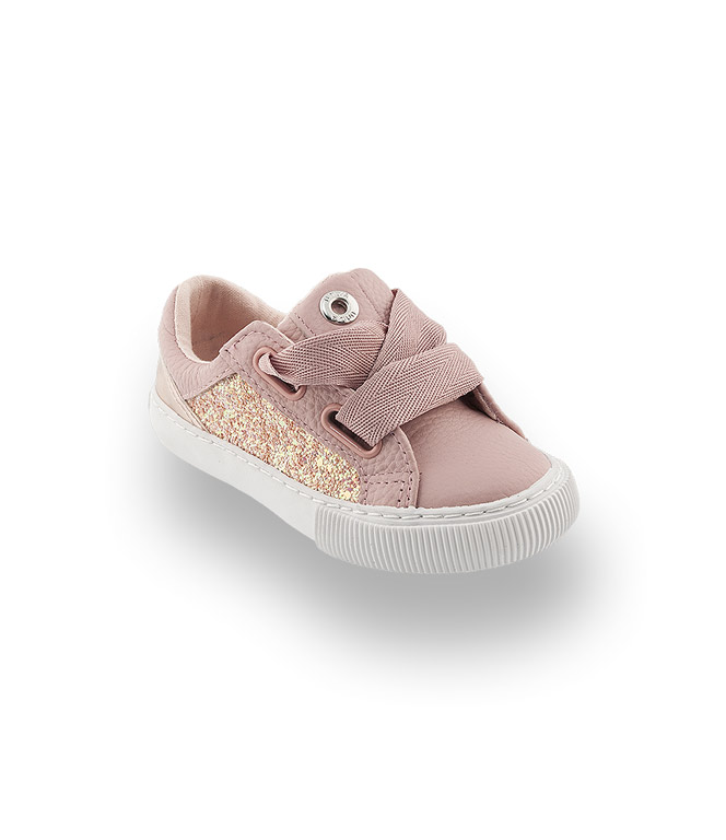 Weiße Kautschuksohle, weiches Leder, Glitter und Metallicleder an der Ferse überzeugen nicht nur im Design. Dominante Ösen zieren den sportlichen Schuh und die breite Schleife wirkt adrett und bietet den nötigen Halt. Ein Leinenfutter garantiert den Wohlfühleffekt.