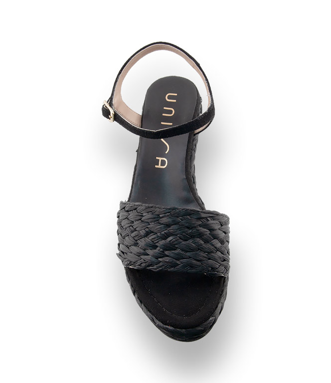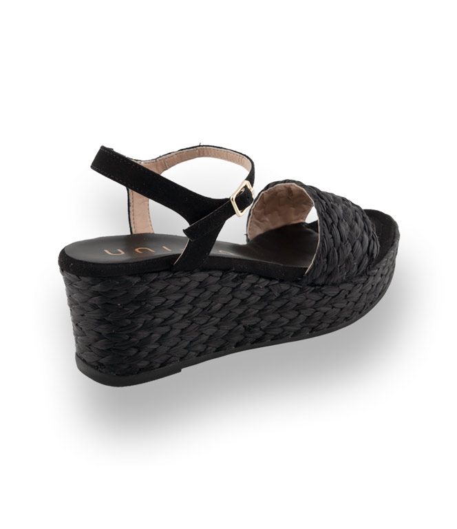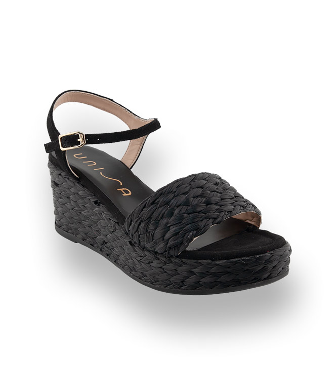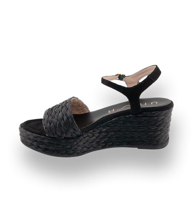 Schwarze, geflochtene Bastbänder, ein tolles Material, das den Sommer einleitet. Ledergefüttert und Veloursleder im Zehenbereich und das Fesselriemchen ebenfalls aus velour. Der stylische Keil, mit Gummilaufsohle, misst im Absatz 7 cm im Sohlenbereich 3 cm. Wedges sind ein unverzichtbarer Sommerbegleiter, lassen sich wunderbar kombinieren und sind herrlich bequem. Unisa - pfiffige Schuhmode aus Spanien.