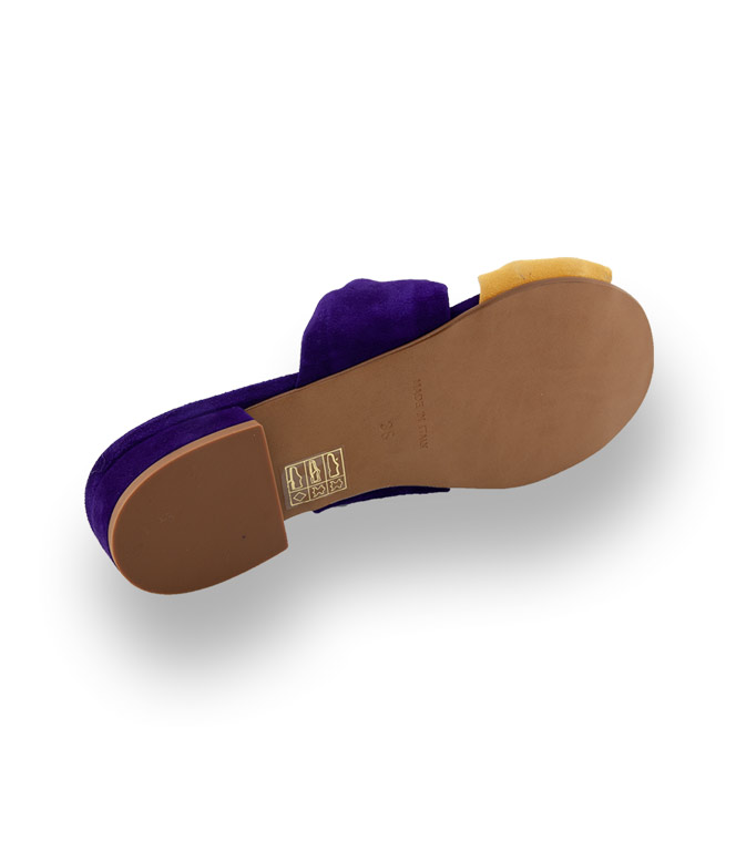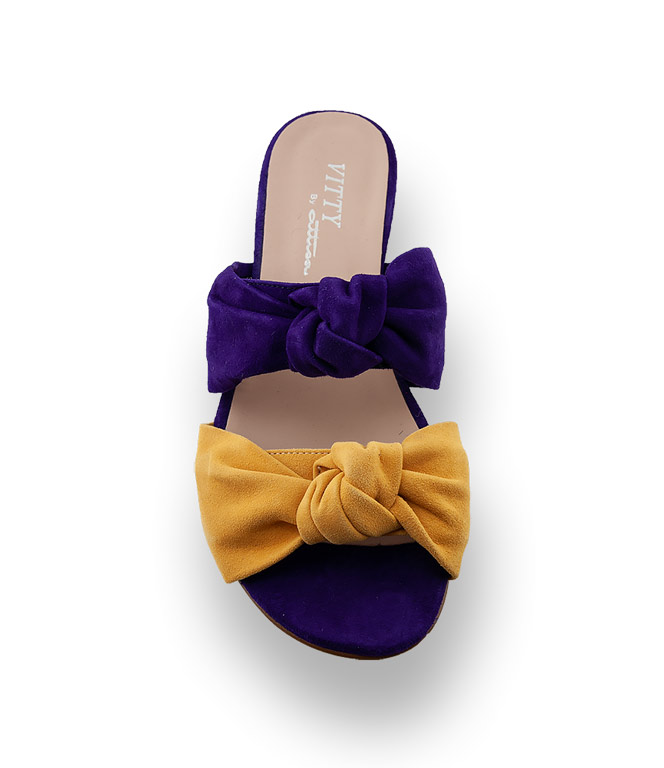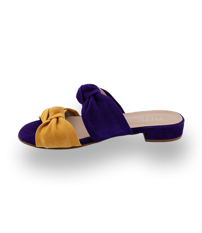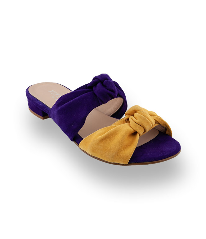 Die umwerfend schöne Farbkombi sorgt für Aufregung und veredelt ihre Sommergarderobe. Pfiffig verschlungene Riemen, in butterweichem Velour umschmeicheln ihre Füße und bieten sicheren Halt. Die gepolsterte Lederdecksohle und der kleine Absatz machen diese Pantolette in gelb - viola auch an heißen Sommertagen zum Vergnügen.